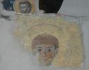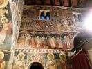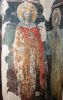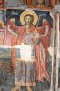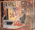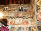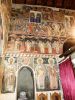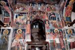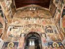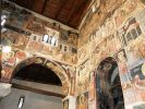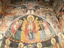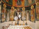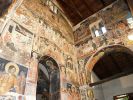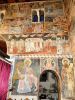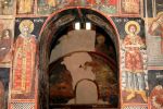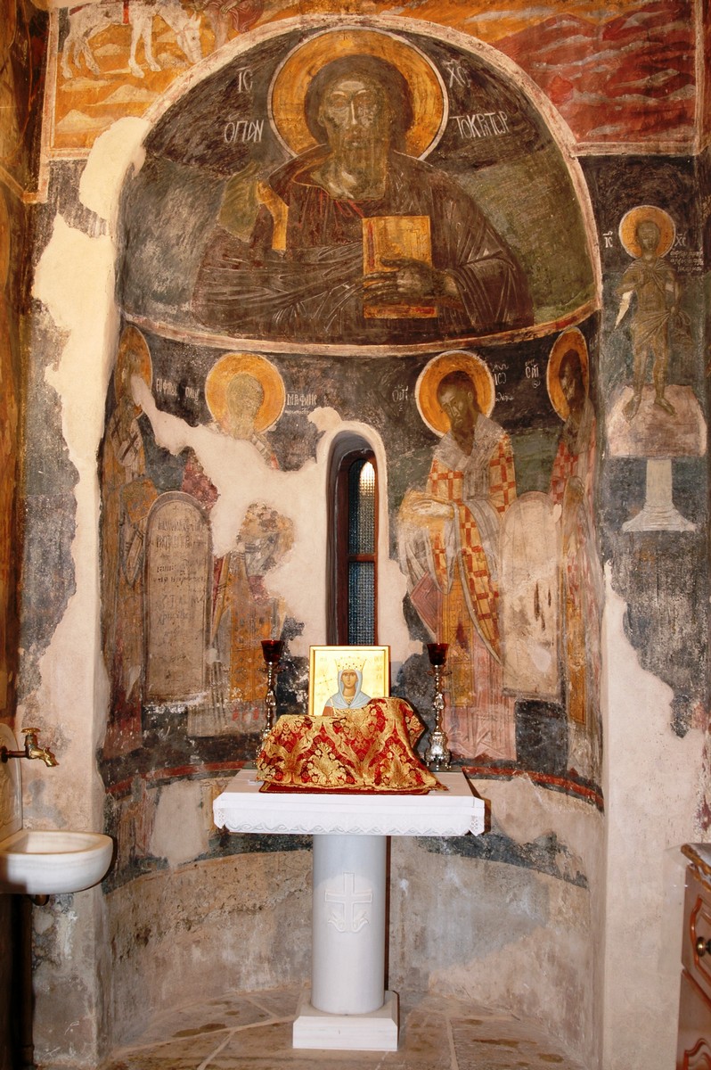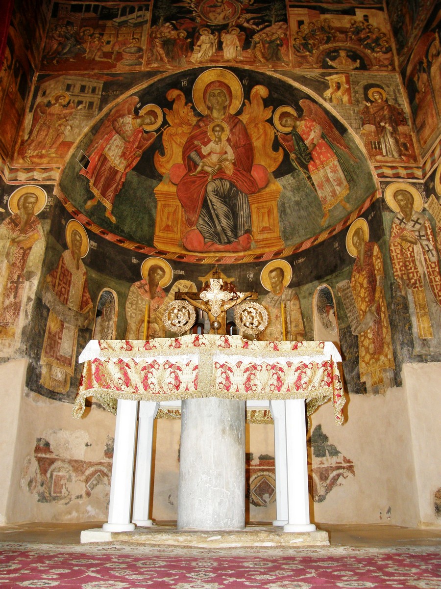 Τμήματα τοιχογραφιών της α'. φάσης (περί τα μέσα του 13ου αιώνα) συναντούμε στα δύο αετώματα του κεντρικού κλίτους (μορφές προφητών) στην Πρόθεση και στο Διακονικό. Της β'. φάσης (τέλος του 13ου - αρχές 14ου αιώνα) είναι ελάχιστα τμήματα τοιχογραφιών του νάρθηκα - οι υπόλοιπες επιφάνειες έχουν επιχρισθεί ή έχουν επικαλυφθεί απ' το δεύτερο ζωγραφικό στρώμα- καθώς και οι τοιχογραφίες που υπήρχαν στην εξωτερική δυτική πλευρά του ναού και οι οποίες σήμερα δε διακρίνονται απ' τις φθορές που έχουν υποστεί. Στην 3η φάση επιζωγραφήθηκε ο νάρθηκας, και είναι οι τοιχογραφίες που καλύπτουν σήμερα την ανατολική του κυρίως πλευρά και οι οποίες έχουν τη διάταξη εικονοστασίου του τέμπλου.