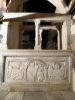 Στην πλάκα που βλέπει προς τον κυρίως ναό -και συγκεκριμένα στο τριγωνικό αέτωμα που επιστέφει ένα δίλοβο άνοιγμα-απεικονίζονται ρόδακες, ανθέμια και δύο αντωποί δράκοντες, η όλη σύνθεση και η τεχνοτροπία της προδίδουν δυτική επίδραση.