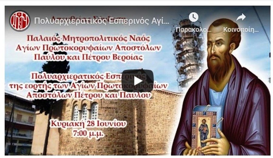 Παρακολουθήστε σήμερα Κυριακή 28 Ιουνίου στις 7:00 μ.μ. τον Πολυαρχιερατικό Εσπερινό της εορτής των Αγίων Πρωτοκορυφαίων Αποστόλων Πέτρου και Παύλου Βεροίας.