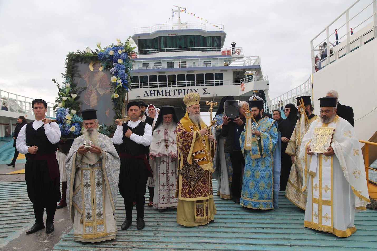 Πρό τοῦ «Δι' εὐχῶν» τελέσθηκε ἡ καθιερωμένη Λιτανεία μέ στάση γιά δέηση στά καράβια τοῦ Πορθμείου, τά ὁποῖα τήν ὑποδέχθηκαν μέ ἤχους ἀπό τίς κόρνες τους. Τήν λιτανεία συνόδευσε ἡ Φιλαρμονική τοῦ Ἀντιρρίου «Ἀπόλλων». Τήν εἰκόνα τοῦ ἁγίου Νικολάου πλαισίωσαν μέλη τοῦ Πολιτιστικοῦ Συλλόγου Ἀντιρρίου «Τό Καστέλλι».