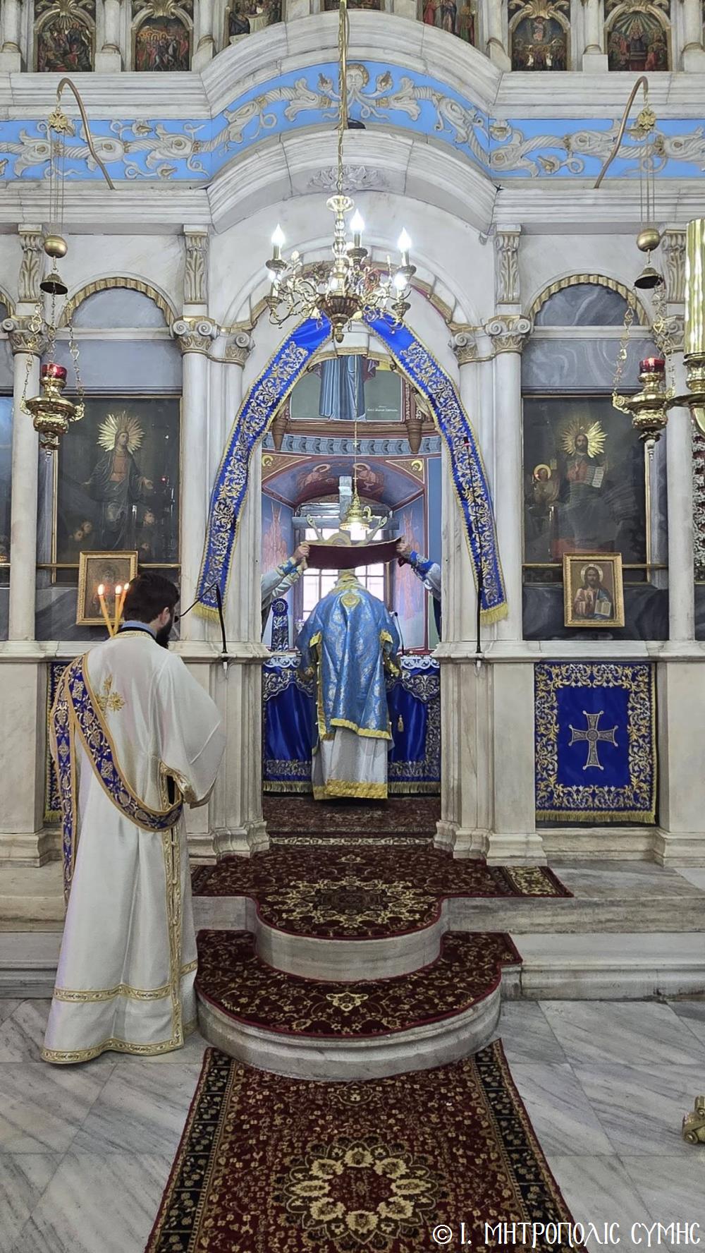Πρό τῆς ἀπολύσεως τῆς Θείας Λειτουργίας, ὁ Σεβασμιώτατος τέλεσε κατά τήν τάξιν τήν ἀκολουθία τοῦ Μεγάλου Ἁγιασμοῦ τῶν Θεοφανείων, «πρός καθαρισμόν ψυχῶν τε καί σωμάτων, πρός ἰατρείαν παθῶν, πρός ἁγιασμόν οἴκων, πρός πᾶσαν ὠφέλειαν ἐπιτήδειον». Ἐκ τοῦ ὕδατος τοῦ ἁγιασμοῦ ἔρανε τούς πιστούς, οἱ ὁποίοι ἐν συνεχείᾳ ἔλαβαν γιά νά ἁγιάσουν τούς οἴκους τους καί μετέλαβαν ἅπαντες, ἀφοῦ εἶναι τὸ «ὕδωρ τῆς ἀναγεννήσεως», τὸ ὁποῖο διὰ τῆς ἐπικλήσεως καὶ ἐπιφοιτήσεως τοῦ ἁγίου Πνεύματος μεταστοιχειοῦται καὶ γίνεται «ἀφθαρσίας πηγή, ἁγιασμοῦ δῶρον, ἁμαρτημάτων λυτήριον, νοσημάτων ἀλεξιτήριον» γιὰ ὅλους ποὺ μεταλαμβάνουν ἐν πίστει ἢ χρίονται μὲ αὐτό.