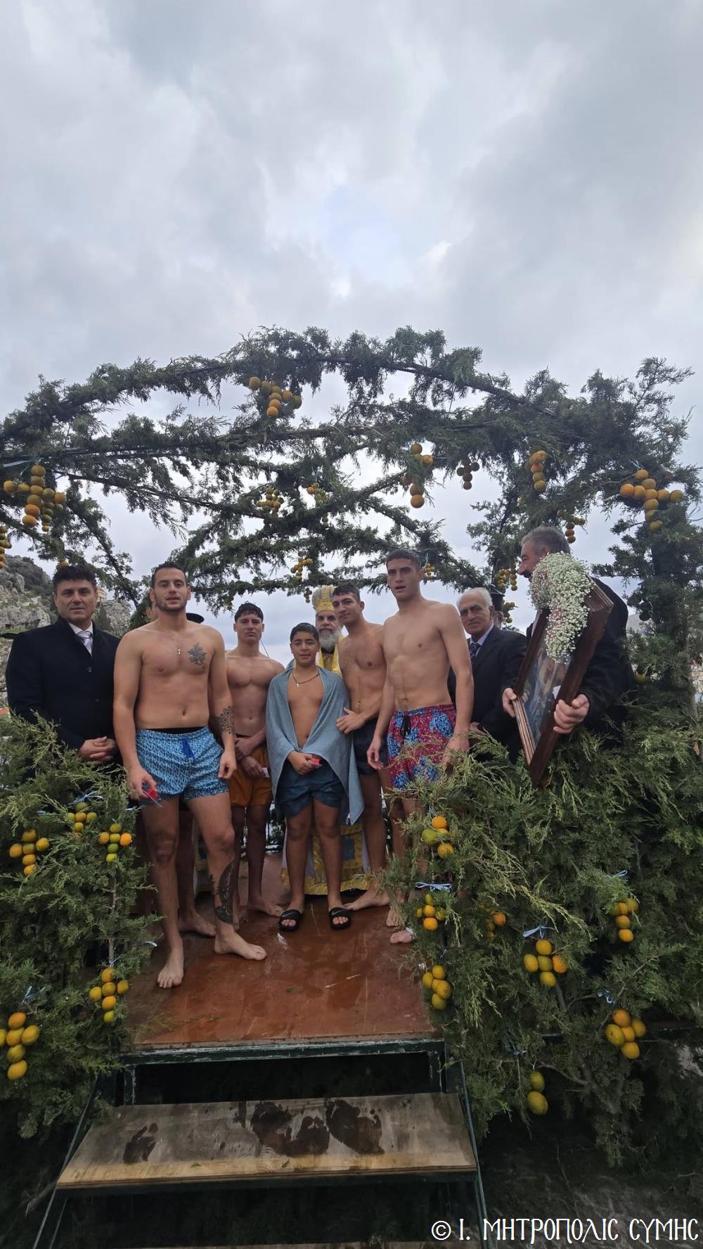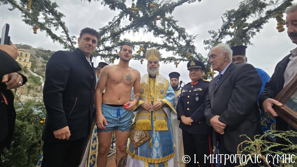 Ἀκολούθως ὁ Σεβασμιώτατος ἐπικεφαλῆς τοῦ Ἱεροῦ Κλήρου, τῶν τοπικῶν Ἀρχόντων καί τοῦ πιστοῦ λαοῦ πορεύθηκε κατά τό ἔθος στό γειτνιάζον γραφικό λιμάνι τῆς Σύμης, ὅπου τέλεσε τήν κατάδυση τοῦ Τιμίου Σταυροῦ καί τόν καθαγιασμό τῶν ὑδάτων. Πολλοί ἦσαν οἱ τολμηροί πού βούτηξαν στά παγωμένα νερά προκειμένου νά ἀνασύρουν τόν Τίμιο Σταυρό καί νά λάβουν τήν Θεία εὐλογία στήν ζωή τους, πρός τούς ὁποίους ὁ Μητροπολίτης μας προσέφερε ὡς εὐλογία καί ἀνάμνηση, ἀναμνηστικόν δῶρο. Εἰς δέ τόν ἀνασύραντα τόν Τίμιο Σταυρό, κ. Ἄγγελο Παπακαλοδούκα, προσέφερε χρυσό ἐπιστήθιο σταυρό.