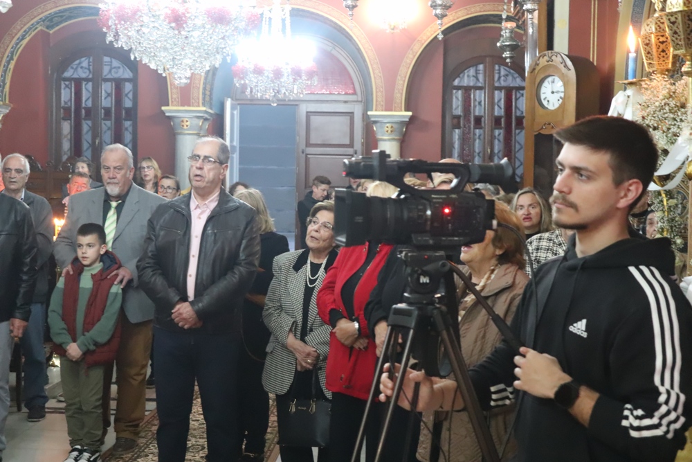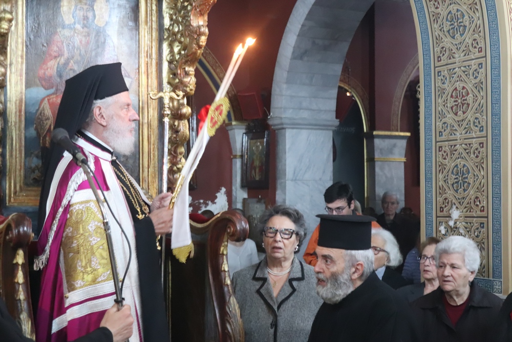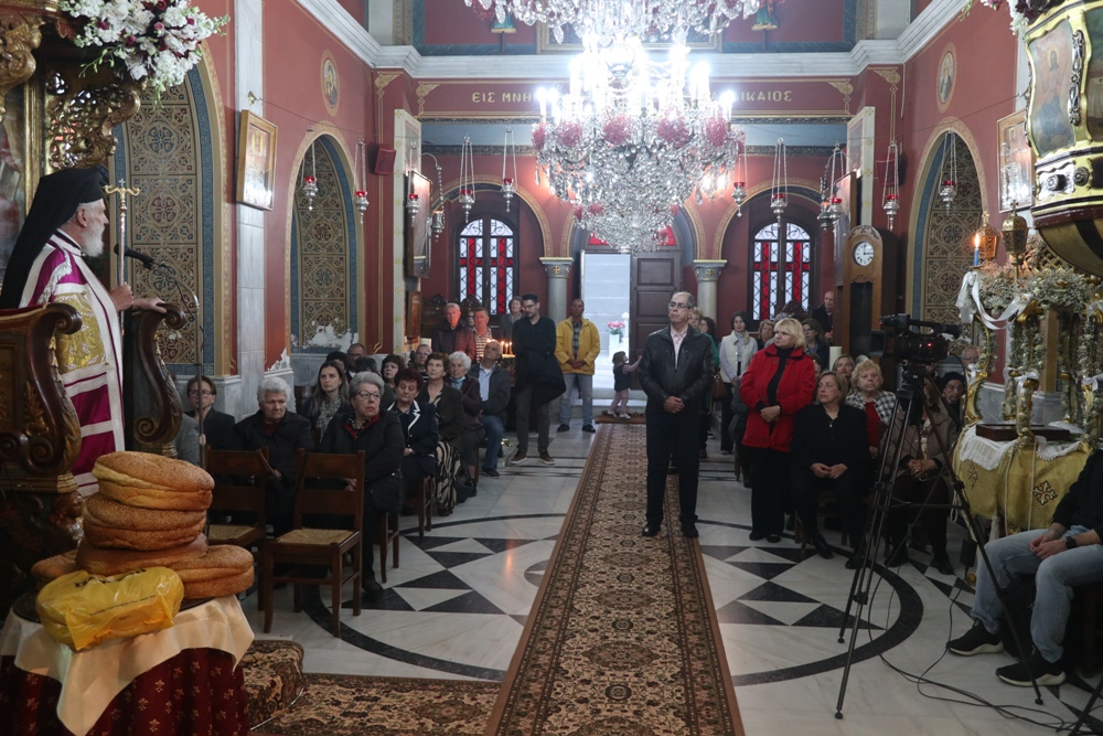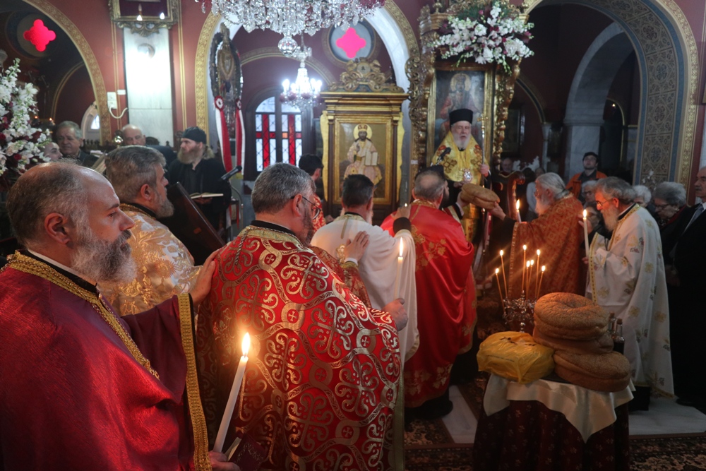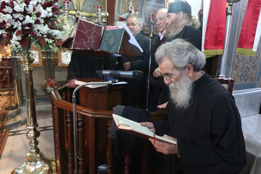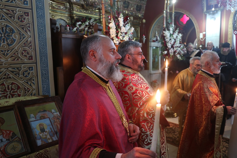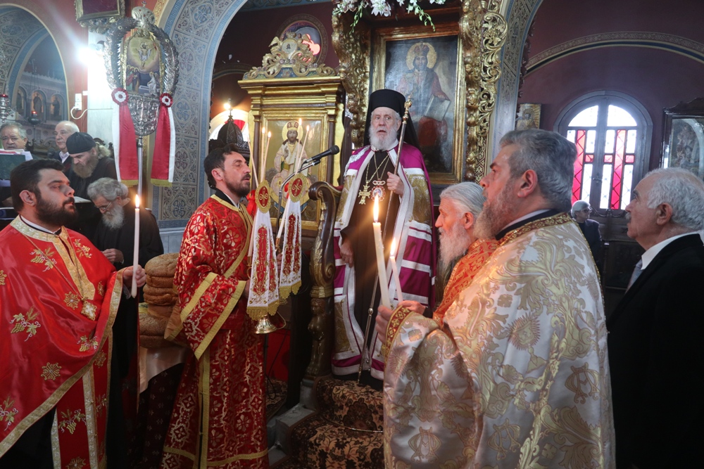 ευχαρίστησε και συνεχάρη ιδιαιτέρως τον Εφημέριο του Ναού, Αρχιμ. Δωρόθεο Γάγγο, για την ευδόκιμο διακονία του προς την Ιερά Μητρόπολη, τον Οίκο Ευγηρίας και το Ναό και απηύθυνε σε όλους τις εόρτιες ευχές του.