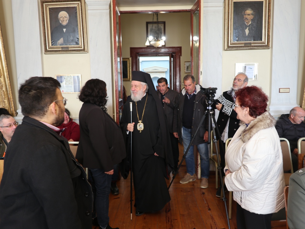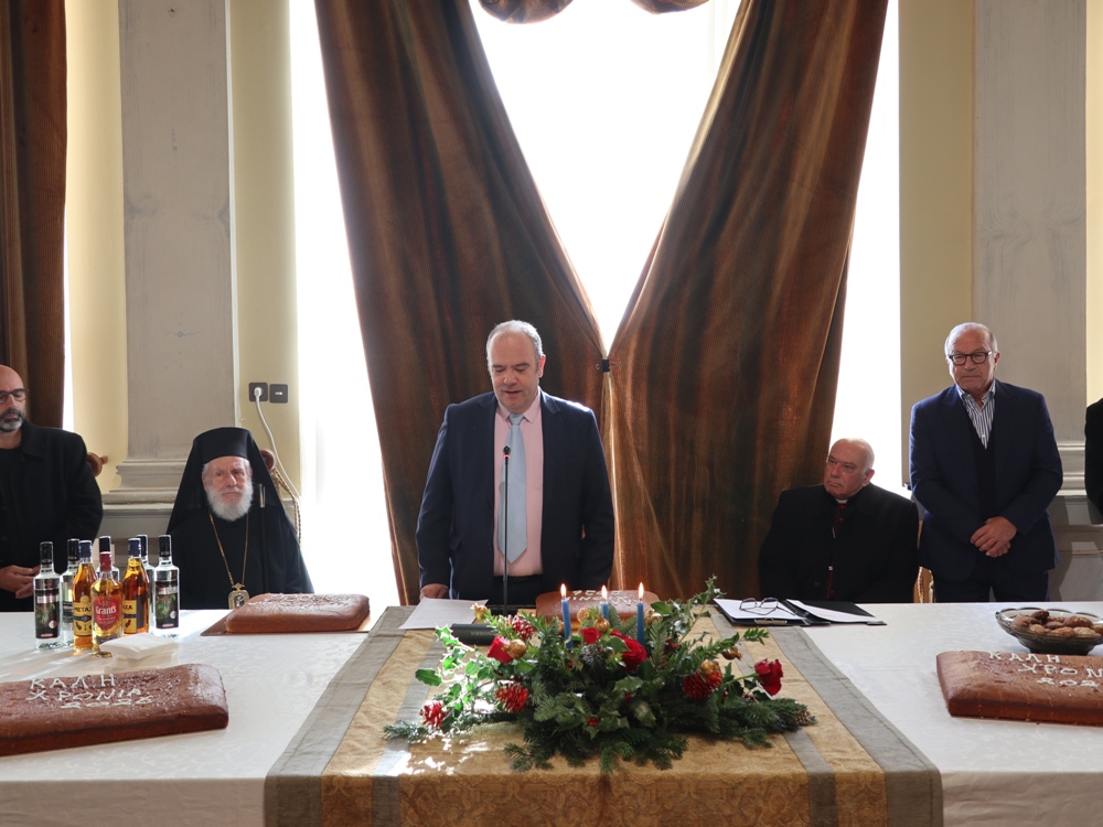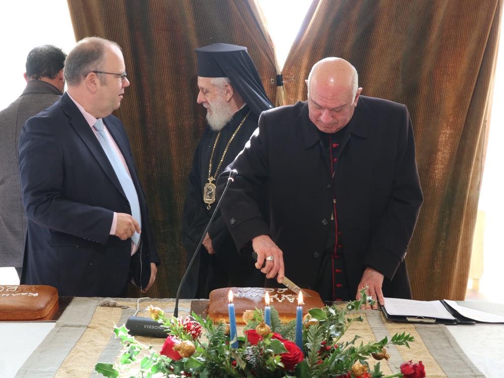 Προσκεκλημένος του Δημάρχου Σύρου-Ερμούπολης κ. Αλέξανδρου Αθανασίου, ο Σεβασμιώτατος κ. Δωρόθεος Β μετέβη στην εμβληματική Αίθουσα Εκδηλώσεων του Μεγαλοπρεπούς δημαρχείου Ερμουπόλεως, όπου και ευλόγησε την κοπή της πίτας του Αγίου Βασιλείου του Δήμου, με την παρουσία του Σεβασμιοτάτου κ. Σεβαστιανού,Τοποτηρητού της καθολικής Επισκοπής Σύρου, του Χωρικού Αντιπεριφερειάρχη Κυκλάδων κ. Γεωργίου Λεονταρίτη , των Αντιδημάρχων, δημοτικών περιφερειακών και κοινοτικών συμβούλων, εκπροσώπων των τοπικών Πολιτικών, Στρατιωτικών, Λιμενικών, Πυροσβεστικών Αρχών και Αστυνομικών Αρχών, του Εισαγγελέως Εφετών Αιγαίου του Προέδρου του Επιμελητηρίου Κυκλάδων και εκπροσώπων Φορέων και Οργανώσεων, και πολλών πολιτών.