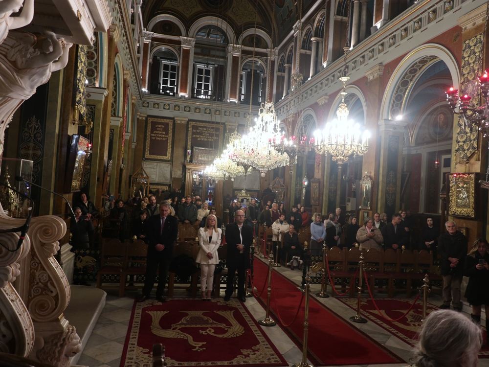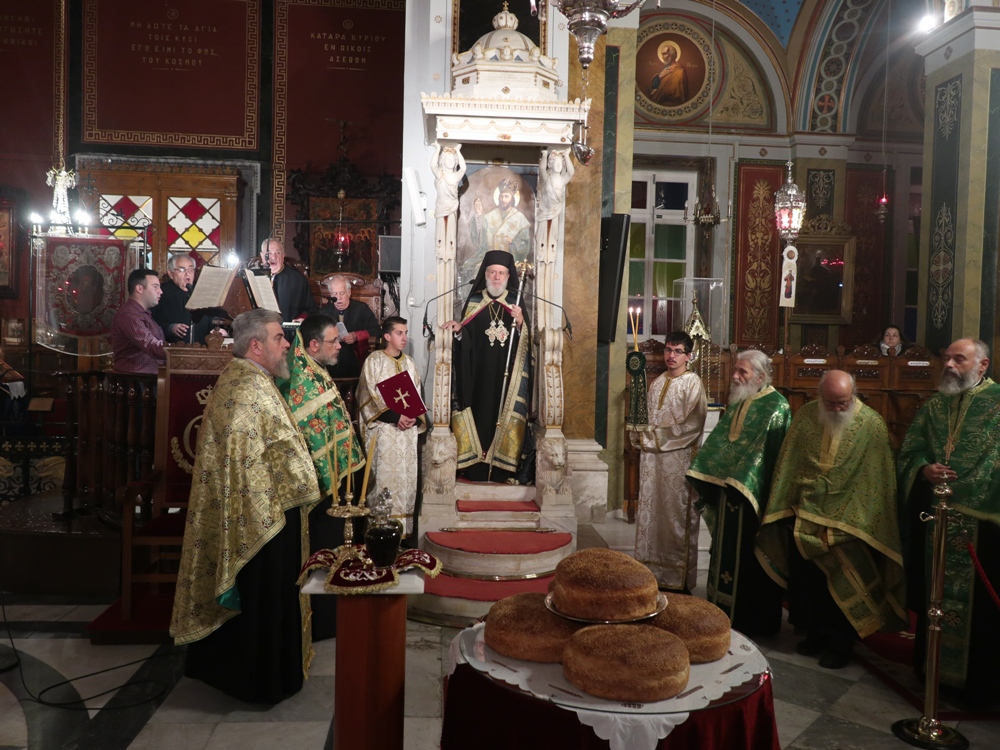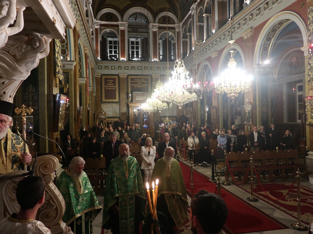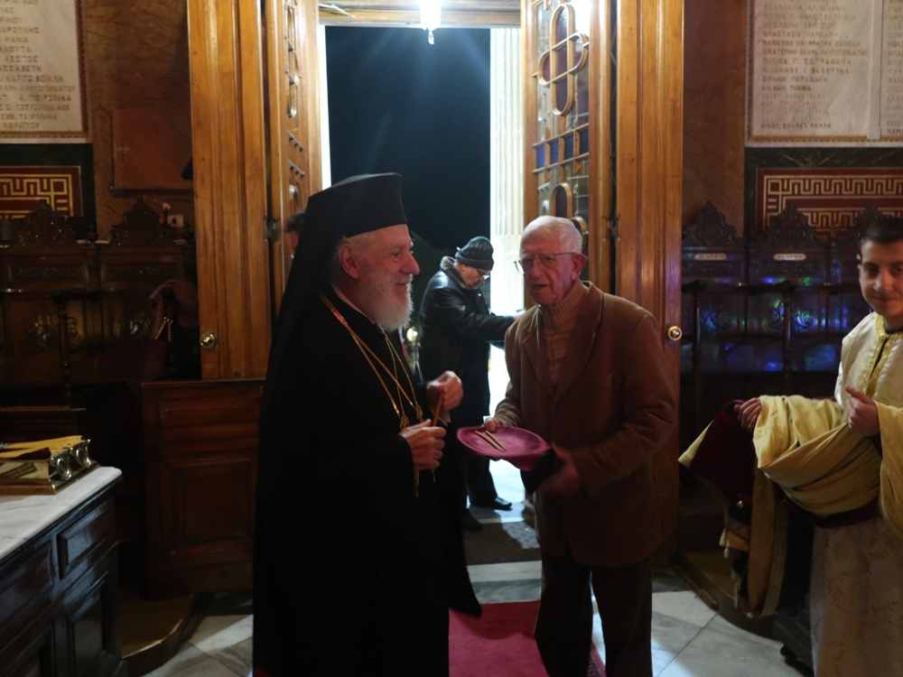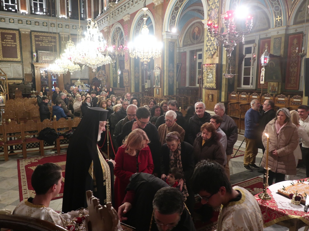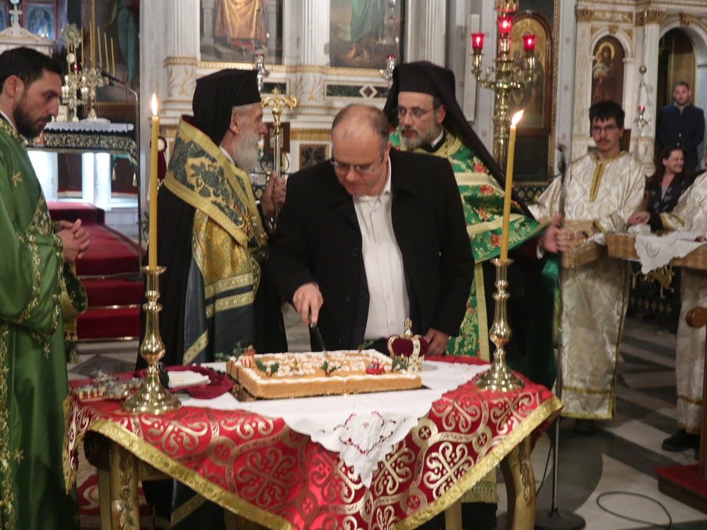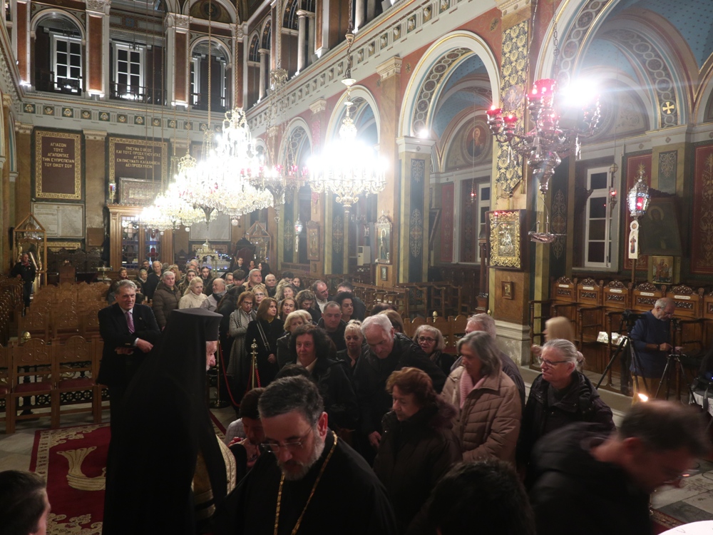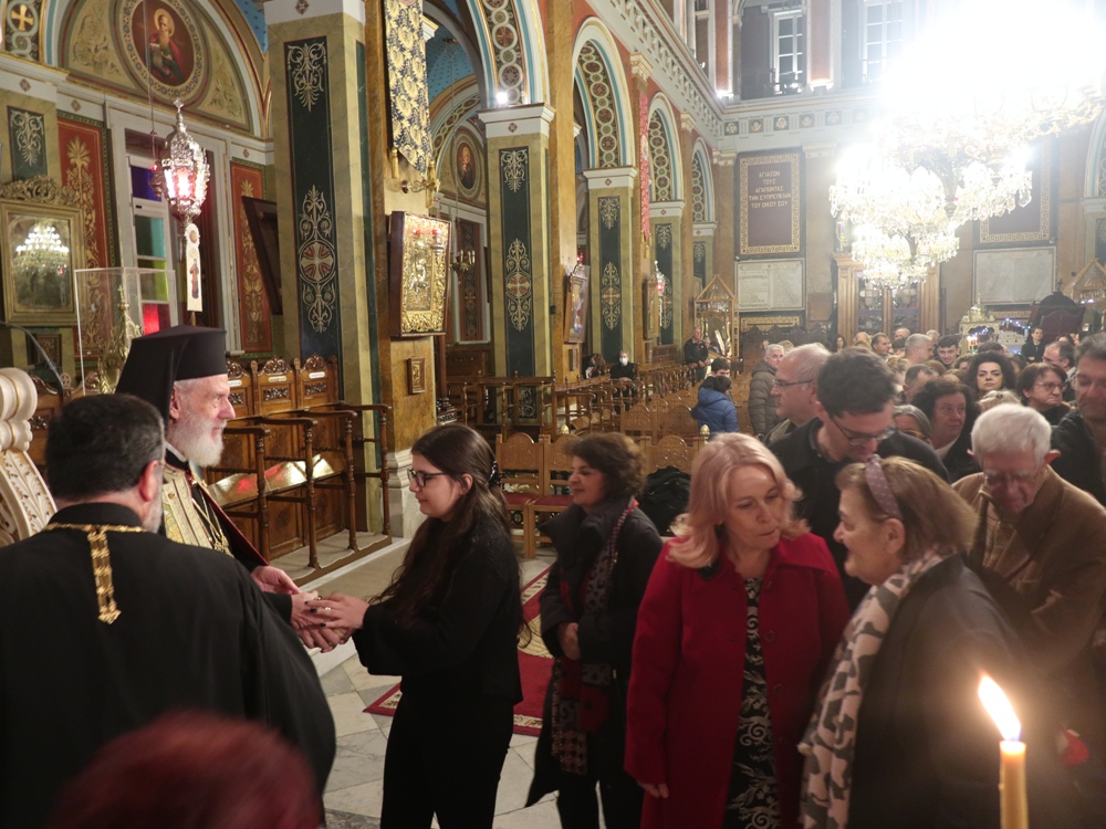 Τέλος, ευχαρίστησε τους Εφημερίους του Ναού, Αρχιμ. Βενέδικτο Φραγκογιάννη και Πρωτοπρ. Λουκά Βασάλο, τους Ιεροψάλτες, και όλους τους παρισταμένους, και ευχήθηκε σ’ αυτούς και, μέσω του Περιφερειακού Τηλεοπτικού Σταθμού «SYROS TV1», οποίος αναμετέδιδε απ’ ευθείας την Ακολουθία, στον Κλήρο και το λαό της Ιεράς Μητροπόλεως υγεία, πρόοδο και ευημερία, μακριά από πολέμους και βίαιες καταστάσεις.