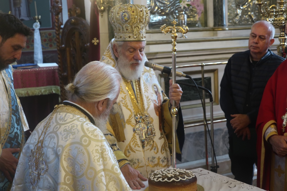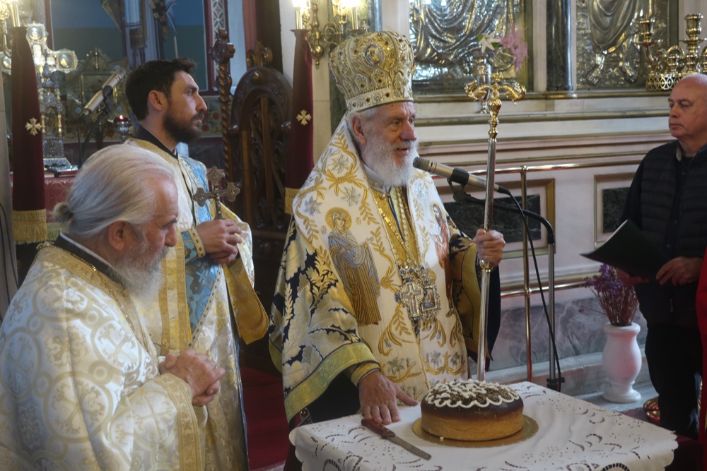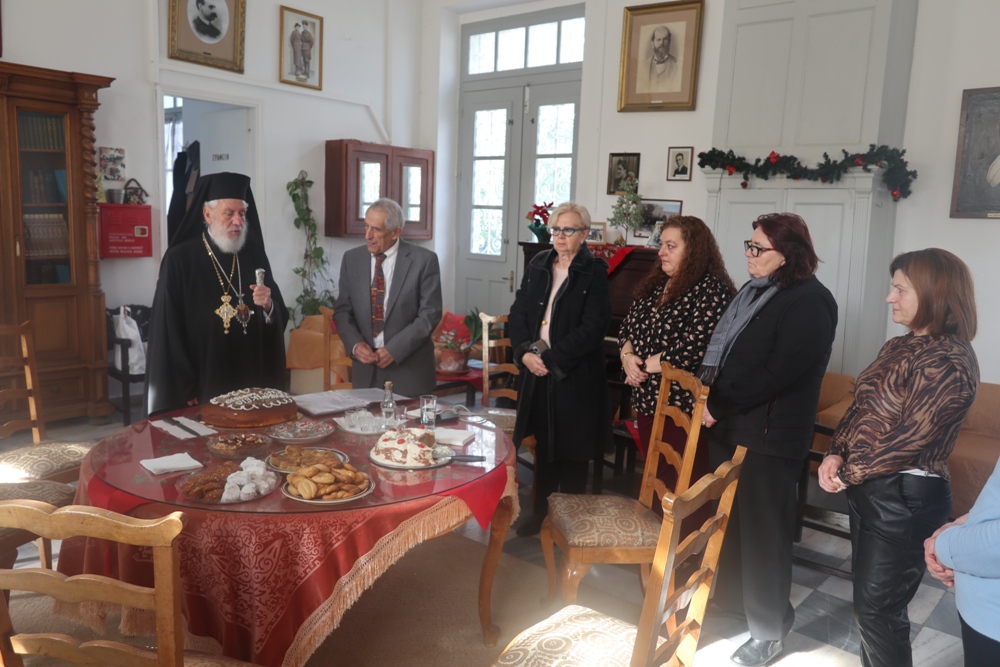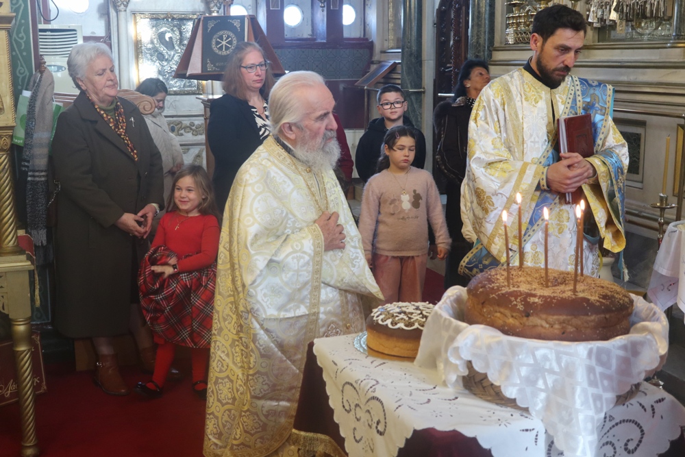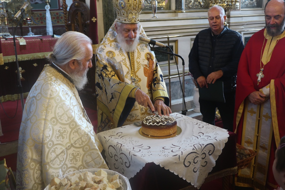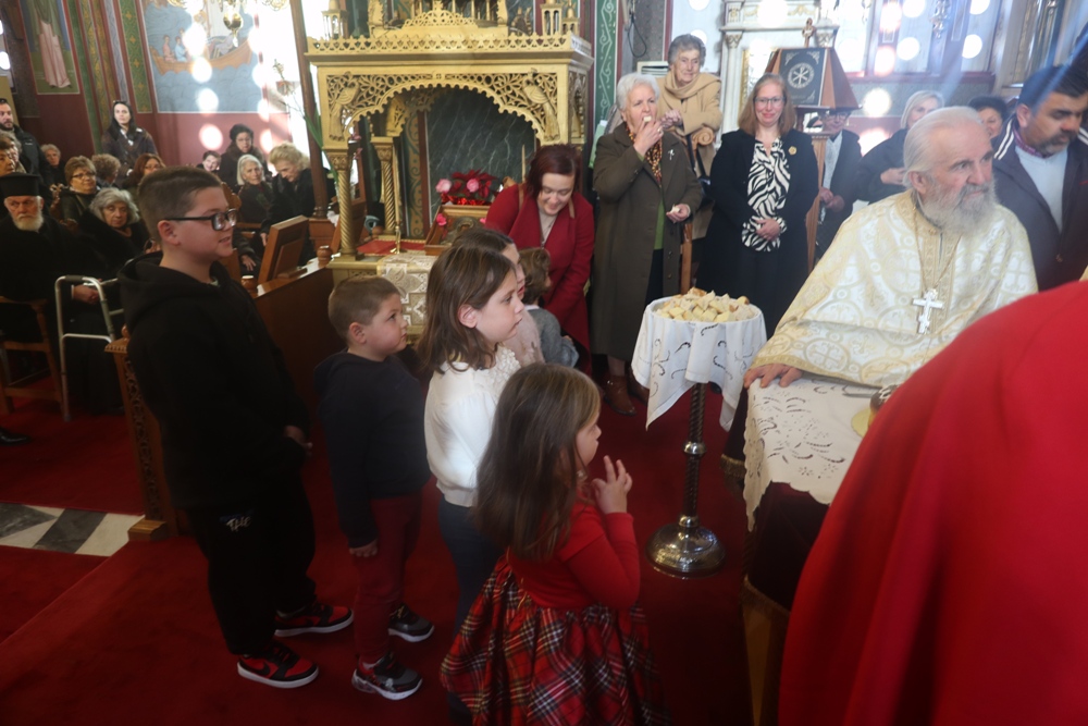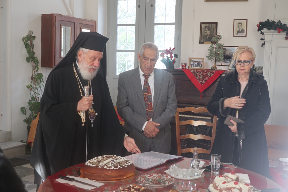 Τέλος, ευλόγησε την πίτα του Αγίου Βασιλείου, ενώ τα παριστάμενα παιδιά έψαλλαν τα κάλαντα, ευχαρίστησε τον Εφημέριο του Ναού για την προετοιμασία της Εκδηλώσεως, και διένειμε στους παρισταμένους ευλογίες και δώρα.