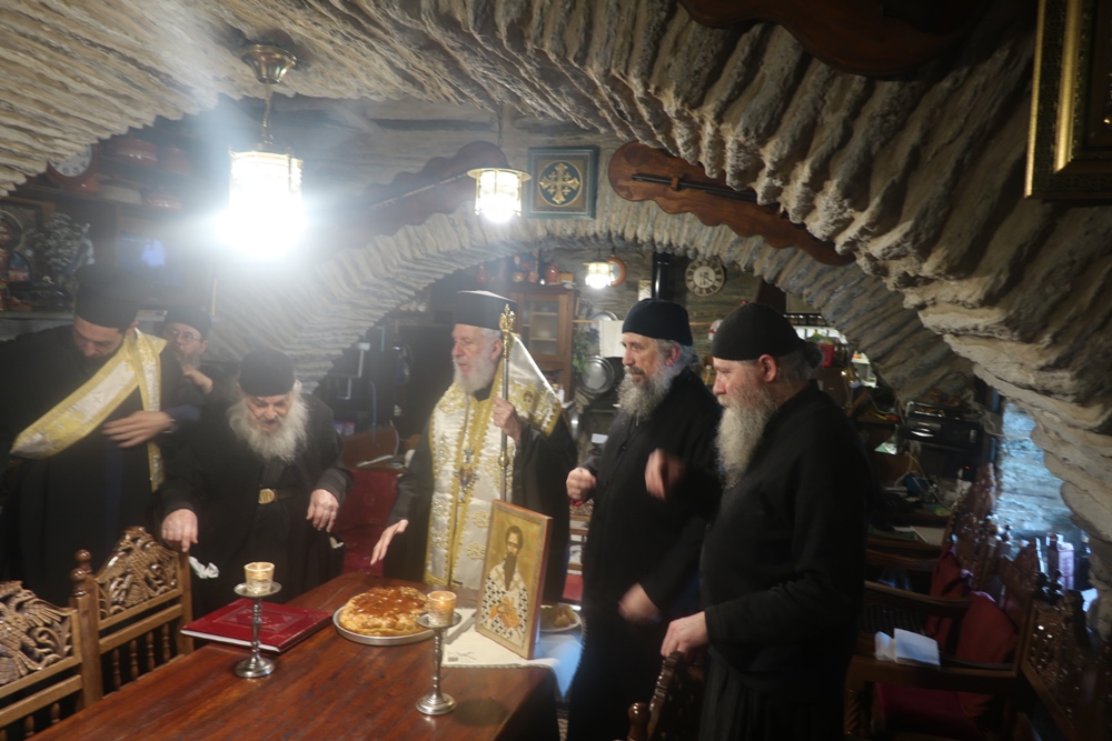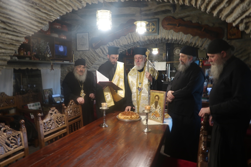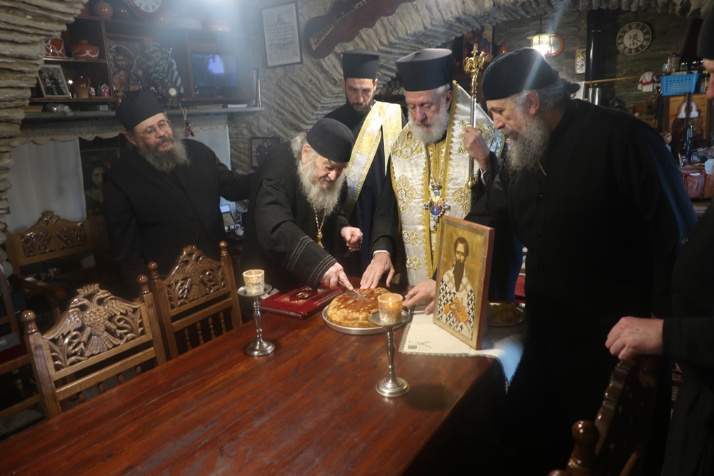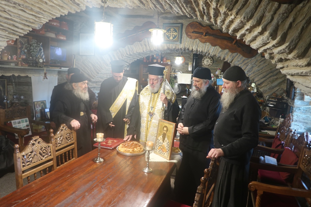 Ακολούθως, πραγματοποιήσε εόρτια ευχετήρια επίσκεψη στην Ιερά Μονή Παναχράντου, όπου ευλόγησε την Αγιοβασιλειόπιτα ευχήθηκε στον Ηγούμενο και τους Πατέρες.