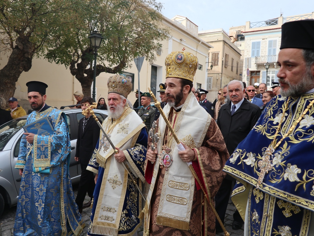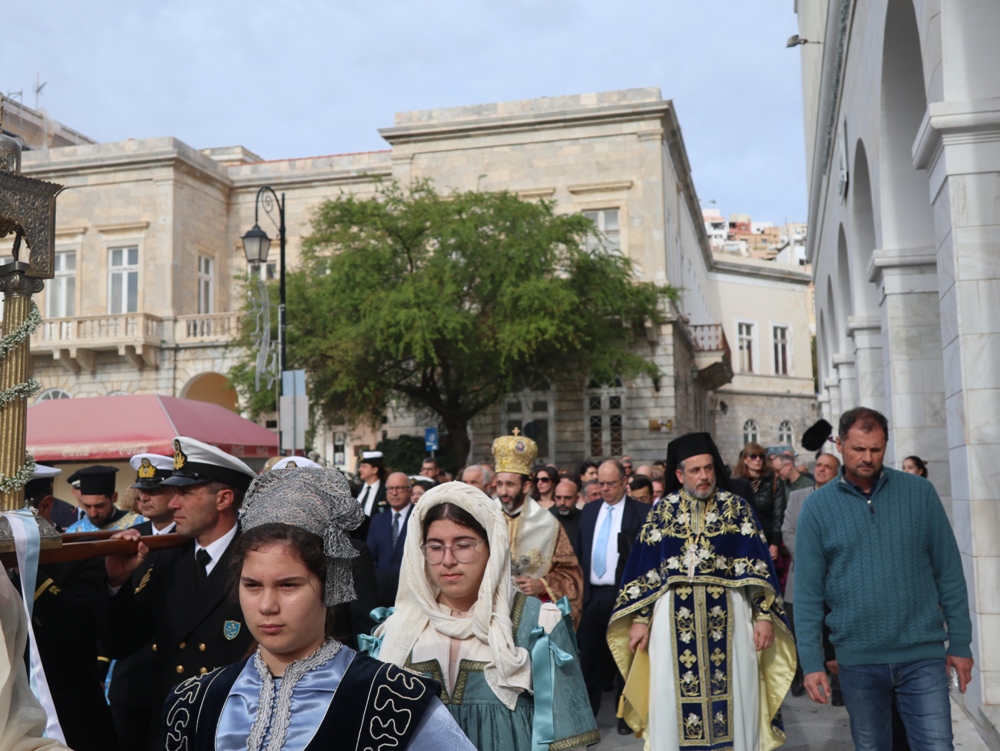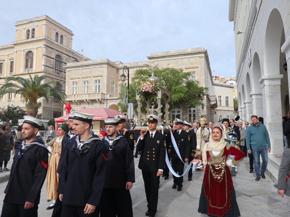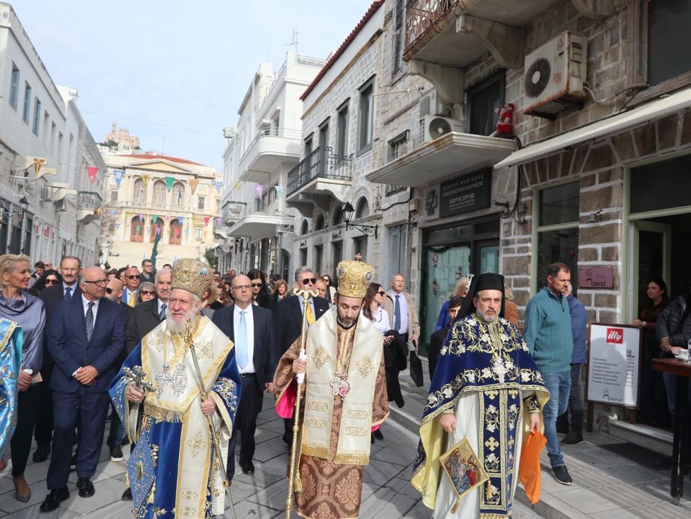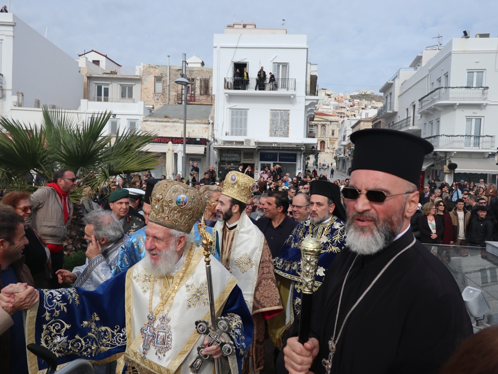 Εκείθεν, η ιερά πομπή, προπορευόμενων του Σεβασμιωτάτου κ. Δωροθέου Β’ και του Σεβασμιωτάτου κ. Παντελεήμονος, με τη συμμετοχή του ιερού Κλήρου της Σύρου, τελεταρχούντος του Αρχιερατικού Επιτρόπου, Πρωτοπρ. Φλαβιανού Αλμπέσκου,με επικεφαλής τη φιλαρμονική του Δήμου Σύρου-Ερμούπολης, πλαισιουμένη από άγημα της ΠΝΒ Σύρου, νέες του Λυκείου Ελληνίδων και Προσκόπους, κατευθύνθηκε προς τον έμπροσθεν του Μνημείου της Εθνικής Αντίστασης προευτρεπισμένο χώρο του λιμένος της Ερμούπολης, όπου ο Σεβασμιωτατος κ. Δωρόθεος Β' απηύθυνε προς το συγκεντρωμένο μέγα πλήθος των Συριανών, οι οποίοι είχαν κατακλύσει τις αποβάθρες του λιμανιού, σύντομη χαιρετιστήρια και εόρτια προσλαλιά, κατά την οποία, αφού καλωσόρισε και ευχαρίστησε τον Σεβασμιώτατο Μητροπολίτη Πτολεμαΐδος κ. Παντελεήμονα, διατελέσαντα Εφημέριο του Ιερού Ναού του Τιμίου Σταυρού Παρακοπής, ανέφερε ότι και εφέτος η ευλογημένη θάλασσα του Αιγαίου αγιάζεται, υπό το φως της χαράς και της ευλογίας του Θεού , ο Οποίος, όπως είπε, «λες και έβαλε την παλάμη του να μας προστατεύσει με ελαφριά συννεφιά από τον δυνατό ήλιο» .