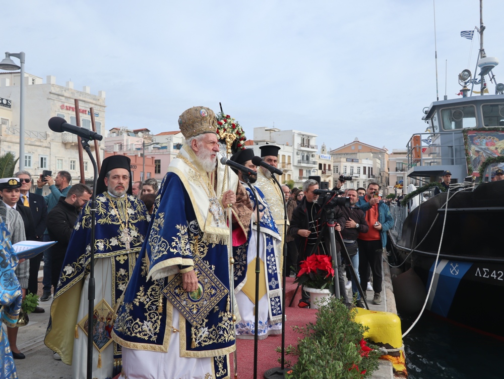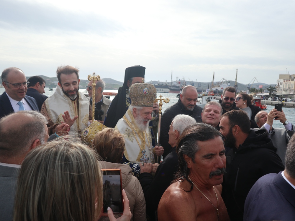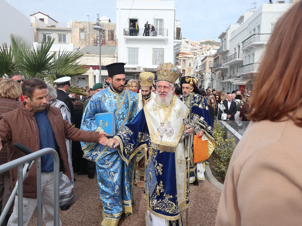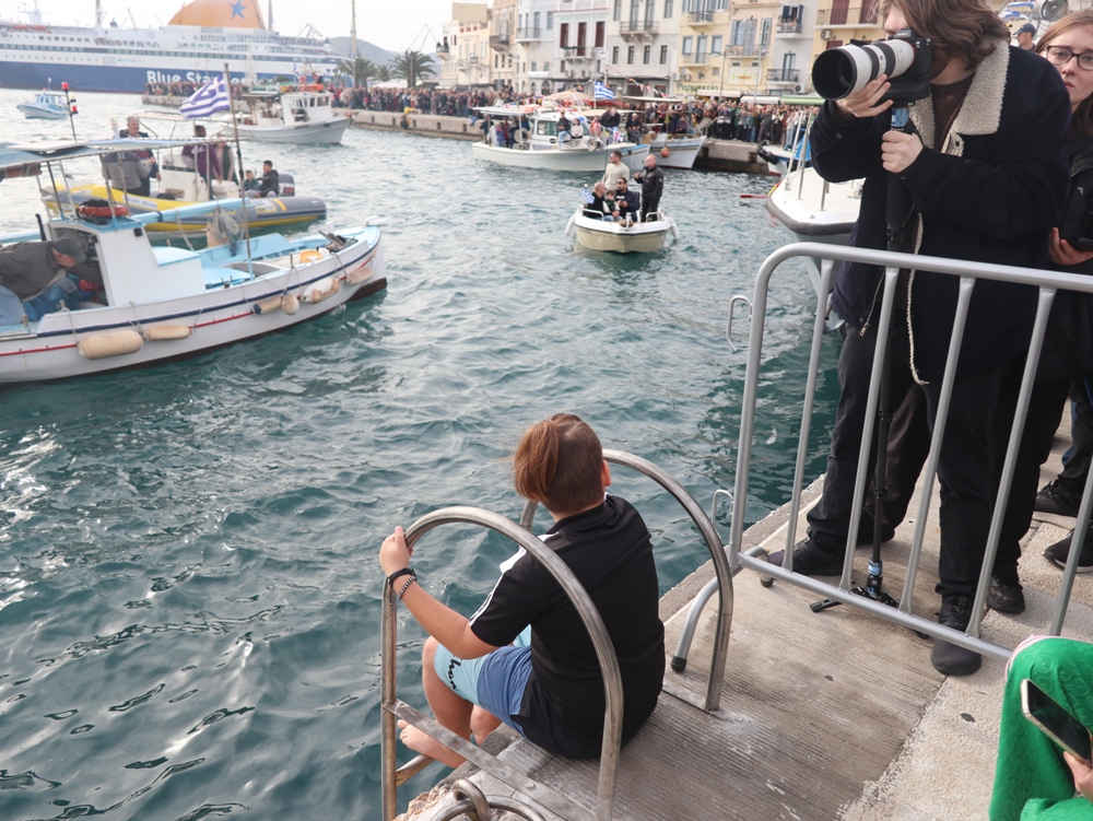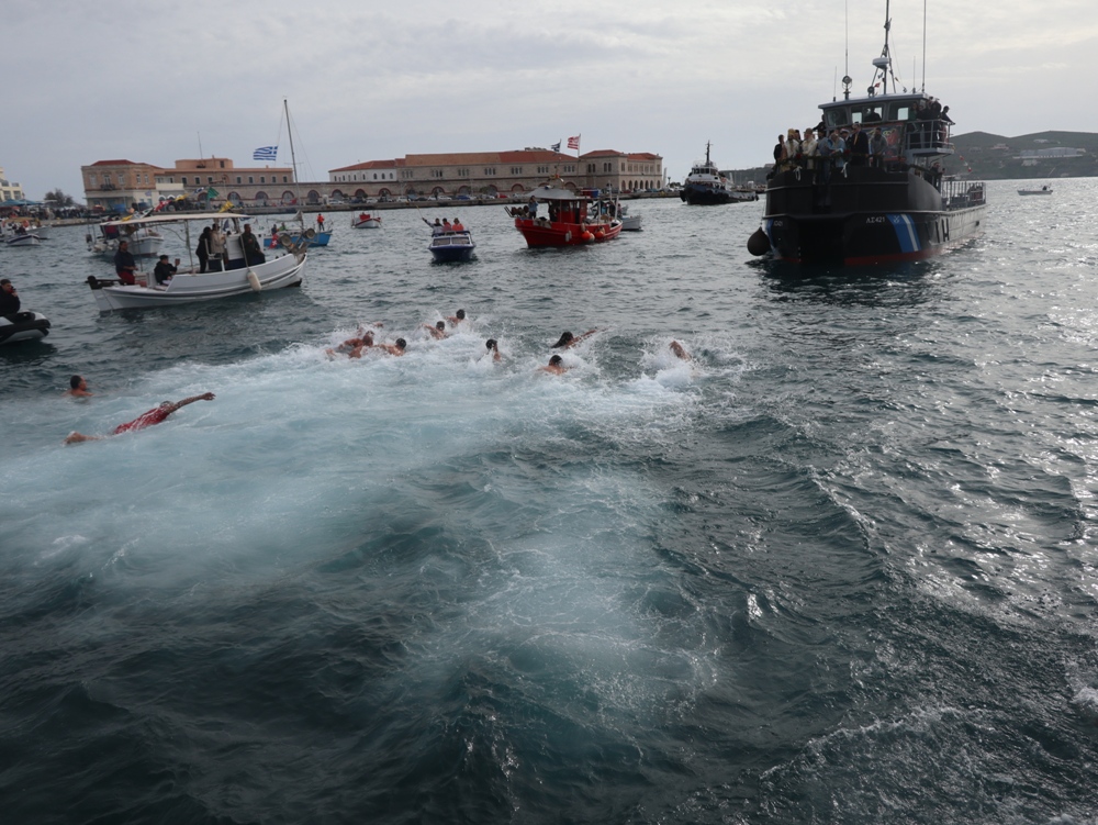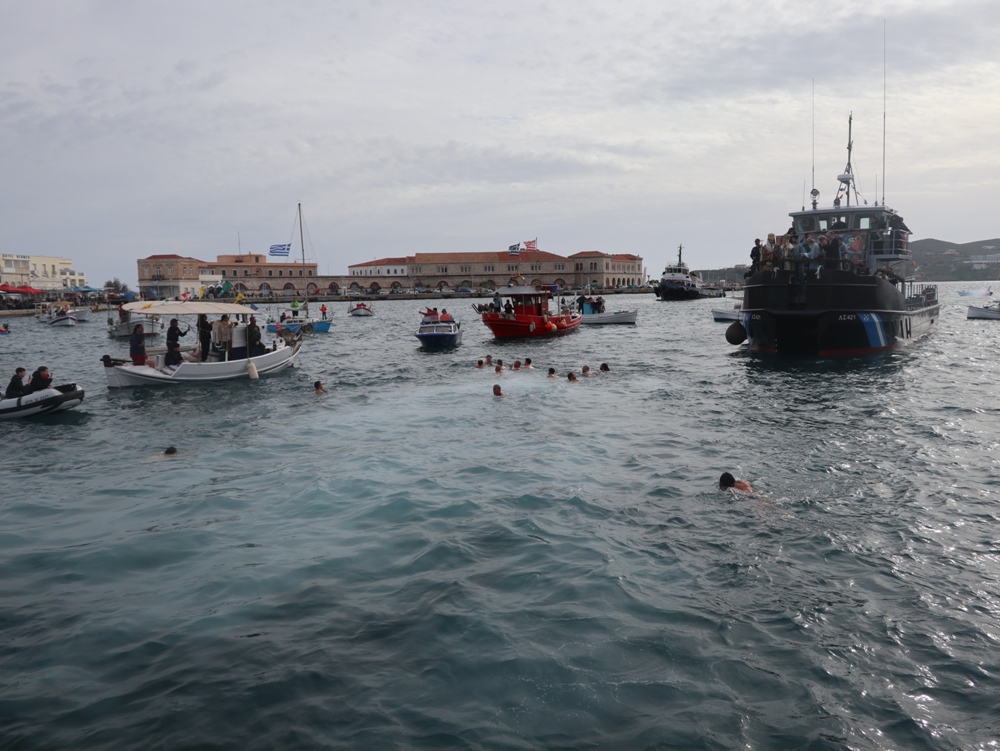 Εν συνεχεία,ο Σεβασμιώτατος κ. Δωρόθεος Β’ επέβη σκάφους του Λιμενικού Σώματος, από την πλώρη του οποίου έρριψε το Σταυρό στη θάλασσα, τον οποίο έσπευσαν τολμηροί νέοι, μεταξύ των οποίων και πενταετές παιδί, και τον οποίο ανέσυρε ο κ. Βασιλ. Κορφιάτης, υπό τα χειροκροτήματα των παρισταμένων, τους εορταστικούς ελιγμούς των μόλις καταπλευσάντων επιβατικών πλοίων «BLUE STAR PAROS» και «BLUE STAR MYKONOS», τους πανηγυρικούς συριγμούς των Ρυμουλκών του Λιμένος Σύρου αγγελματιών και Ερασιτεχνών Αλιέων, του Ομίλου Φουσκωτών και Ταχυπλόων Σκαφών Σύρου και του Σωματείου Λεμβούχων και Καβοδετών Σύρου, και υπό τις χαρμόσυνες κωδωνοκρουσίες, δημιουργώντας μια μεγαλειώδη εορταστική ατμόσφαιρα, που απέδειξε, όπως είπε ο Σεβασμιώτατος κ. Δωρόθεος Β’ ότι η Ερμούπολη είναι και αξίζει να είναι η Πρωτεύουσα πόλη των Κυκλάδων και της Περιφέρειας Ν. Αιγαίου.