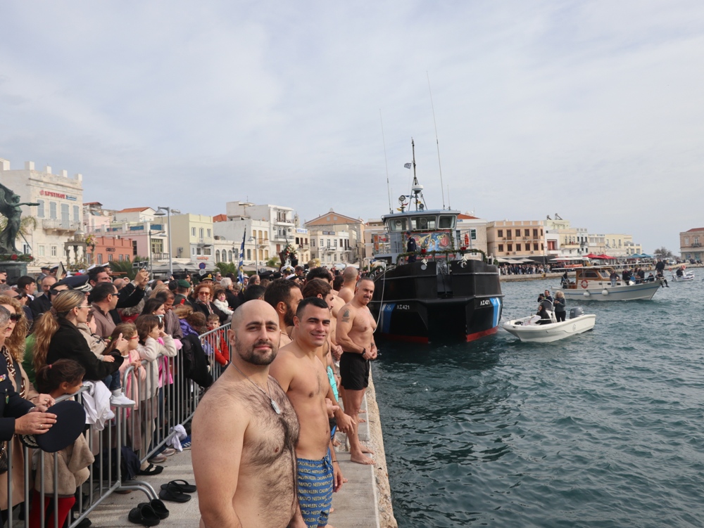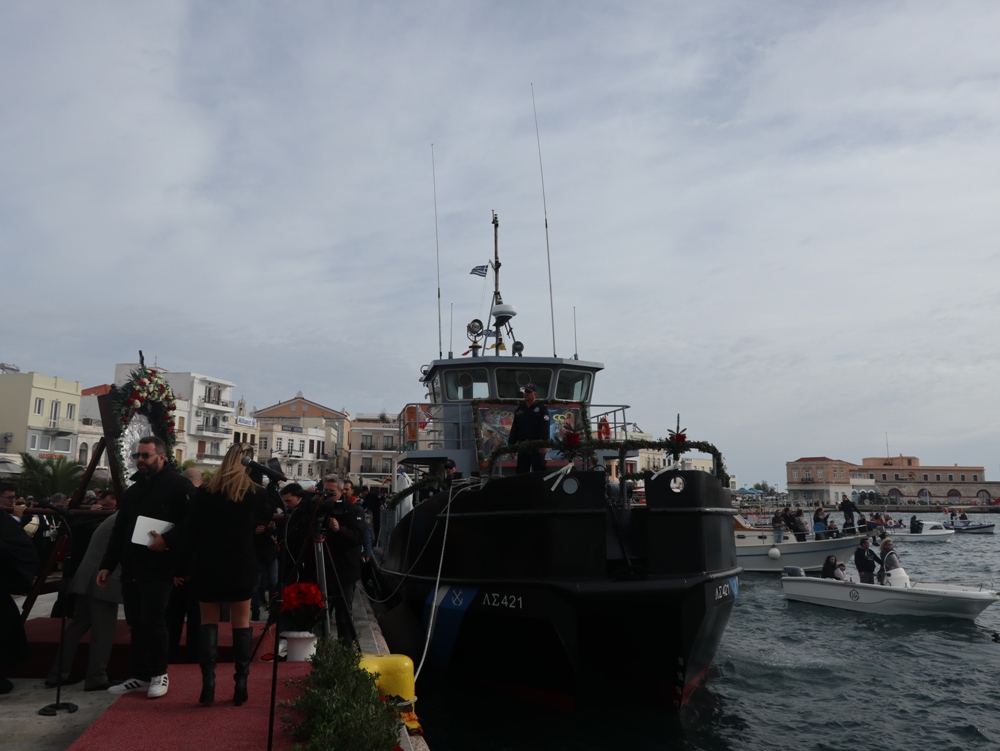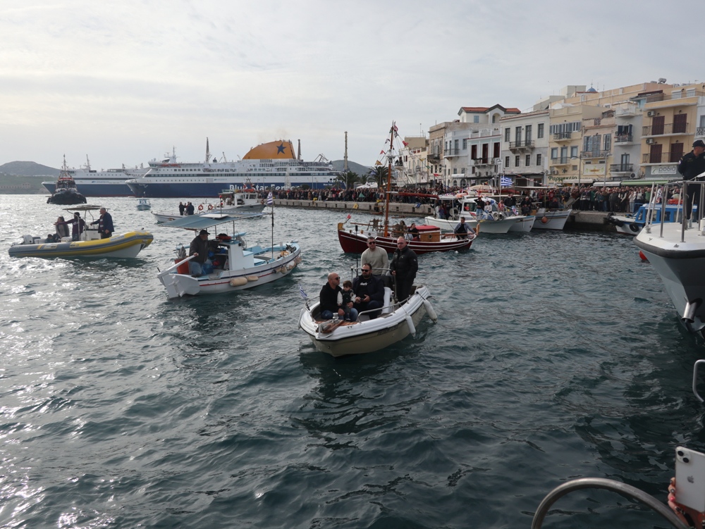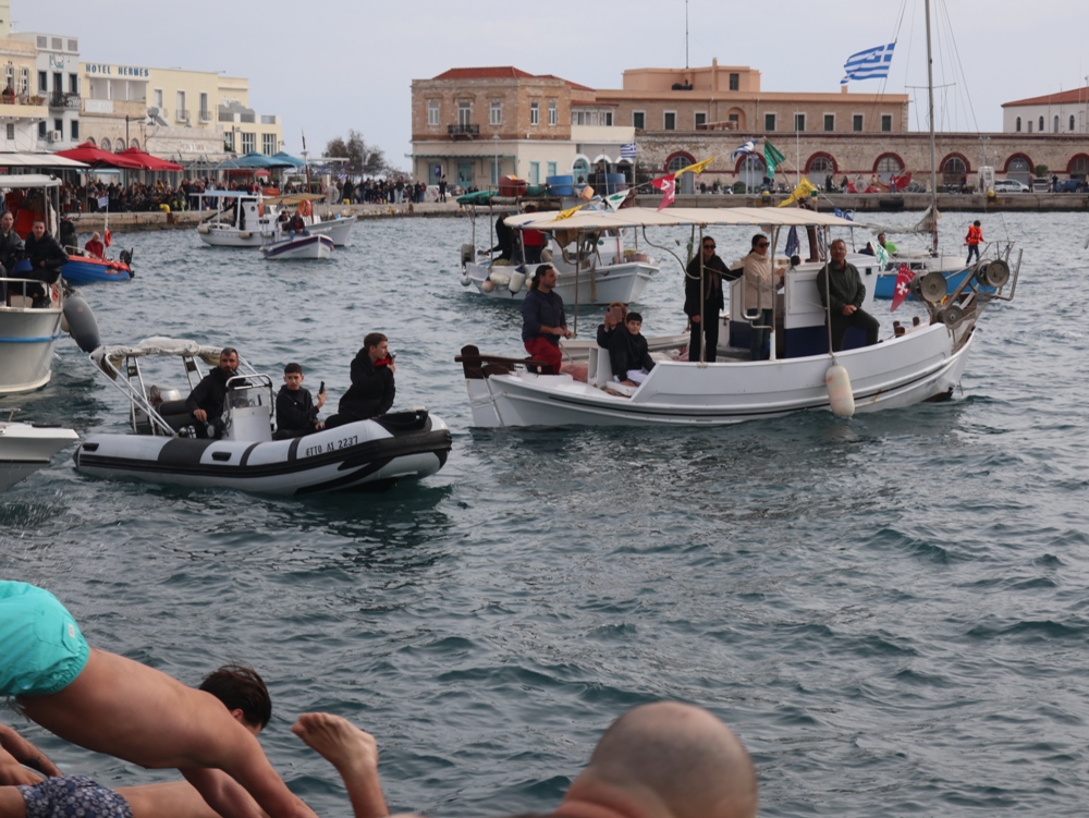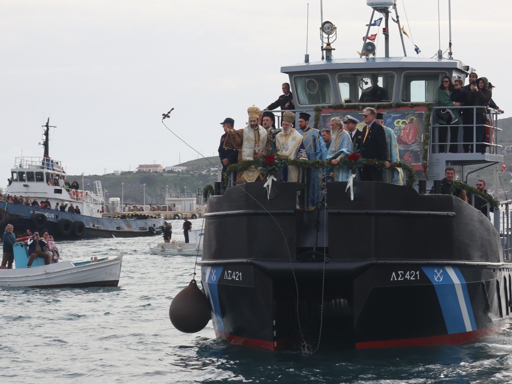 Εν συνεχεία,ο Σεβασμιώτατος κ. Δωρόθεος Β’ επέβη σκάφους του Λιμενικού Σώματος, από την πλώρη του οποίου έρριψε το Σταυρό στη θάλασσα, τον οποίο έσπευσαν τολμηροί νέοι, μεταξύ των οποίων και πενταετές παιδί, και τον οποίο ανέσυρε ο κ. Βασιλ. Κορφιάτης, υπό τα χειροκροτήματα των παρισταμένων, τους εορταστικούς ελιγμούς των μόλις καταπλευσάντων επιβατικών πλοίων «BLUE STAR PAROS» και «BLUE STAR MYKONOS», τους πανηγυρικούς συριγμούς των Ρυμουλκών του Λιμένος Σύρου αγγελματιών και Ερασιτεχνών Αλιέων, του Ομίλου Φουσκωτών και Ταχυπλόων Σκαφών Σύρου και του Σωματείου Λεμβούχων και Καβοδετών Σύρου, και υπό τις χαρμόσυνες κωδωνοκρουσίες, δημιουργώντας μια μεγαλειώδη εορταστική ατμόσφαιρα, που απέδειξε, όπως είπε ο Σεβασμιώτατος κ. Δωρόθεος Β’ ότι η Ερμούπολη είναι και αξίζει να είναι η Πρωτεύουσα πόλη των Κυκλάδων και της Περιφέρειας Ν. Αιγαίου.