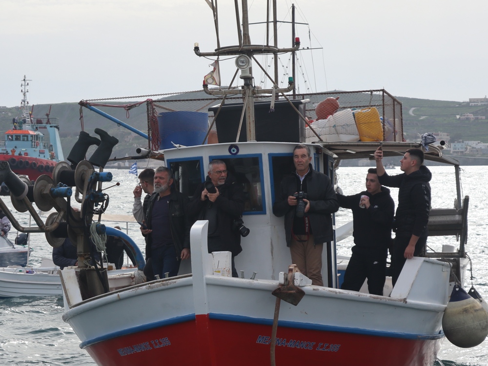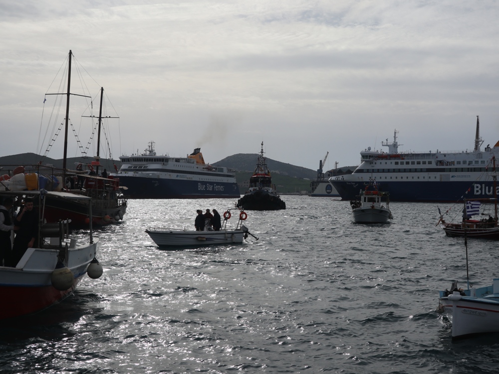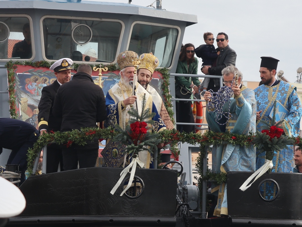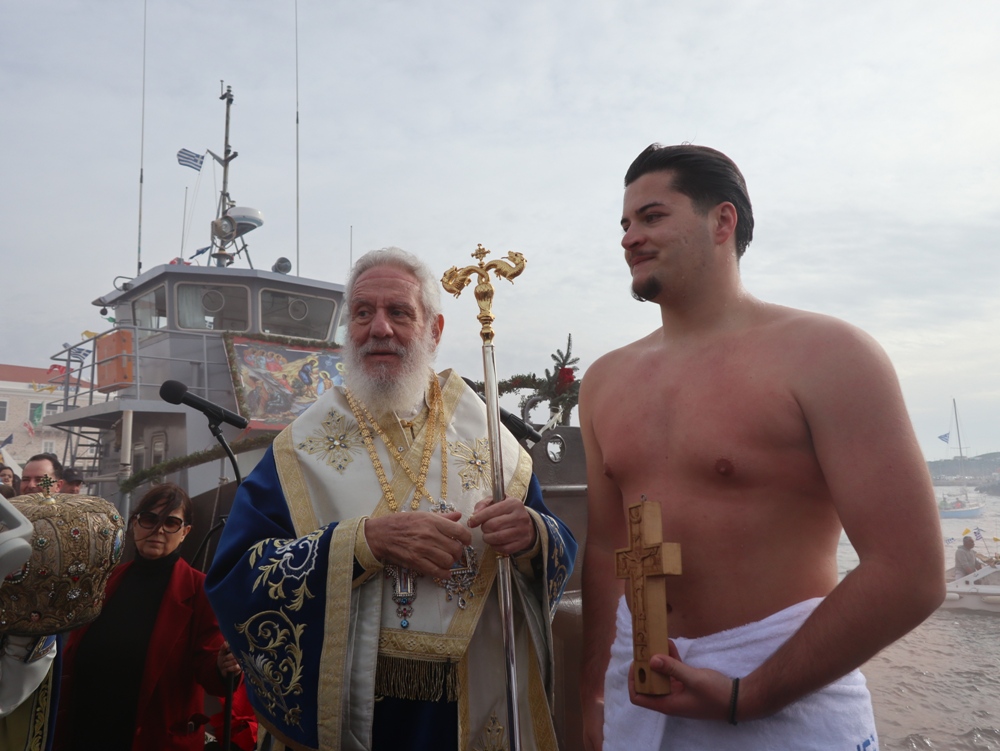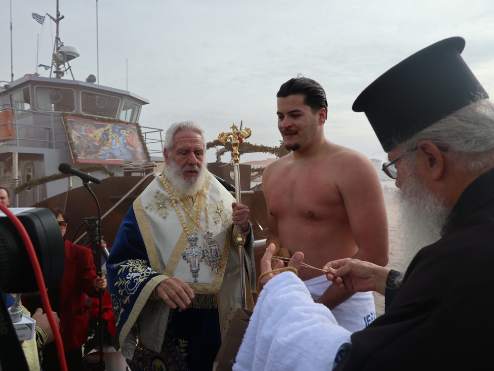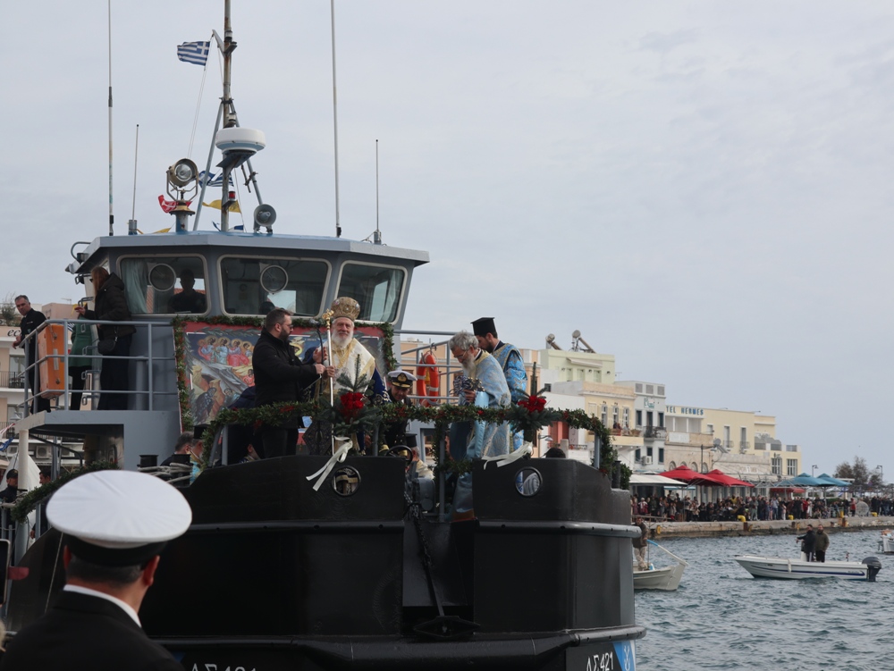 Εν συνεχεία,ο Σεβασμιώτατος κ. Δωρόθεος Β’ επέβη σκάφους του Λιμενικού Σώματος, από την πλώρη του οποίου έρριψε το Σταυρό στη θάλασσα, τον οποίο έσπευσαν τολμηροί νέοι, μεταξύ των οποίων και πενταετές παιδί, και τον οποίο ανέσυρε ο κ. Βασιλ. Κορφιάτης, υπό τα χειροκροτήματα των παρισταμένων, τους εορταστικούς ελιγμούς των μόλις καταπλευσάντων επιβατικών πλοίων «BLUE STAR PAROS» και «BLUE STAR MYKONOS», τους πανηγυρικούς συριγμούς των Ρυμουλκών του Λιμένος Σύρου αγγελματιών και Ερασιτεχνών Αλιέων, του Ομίλου Φουσκωτών και Ταχυπλόων Σκαφών Σύρου και του Σωματείου Λεμβούχων και Καβοδετών Σύρου, και υπό τις χαρμόσυνες κωδωνοκρουσίες, δημιουργώντας μια μεγαλειώδη εορταστική ατμόσφαιρα, που απέδειξε, όπως είπε ο Σεβασμιώτατος κ. Δωρόθεος Β’ ότι η Ερμούπολη είναι και αξίζει να είναι η Πρωτεύουσα πόλη των Κυκλάδων και της Περιφέρειας Ν. Αιγαίου.