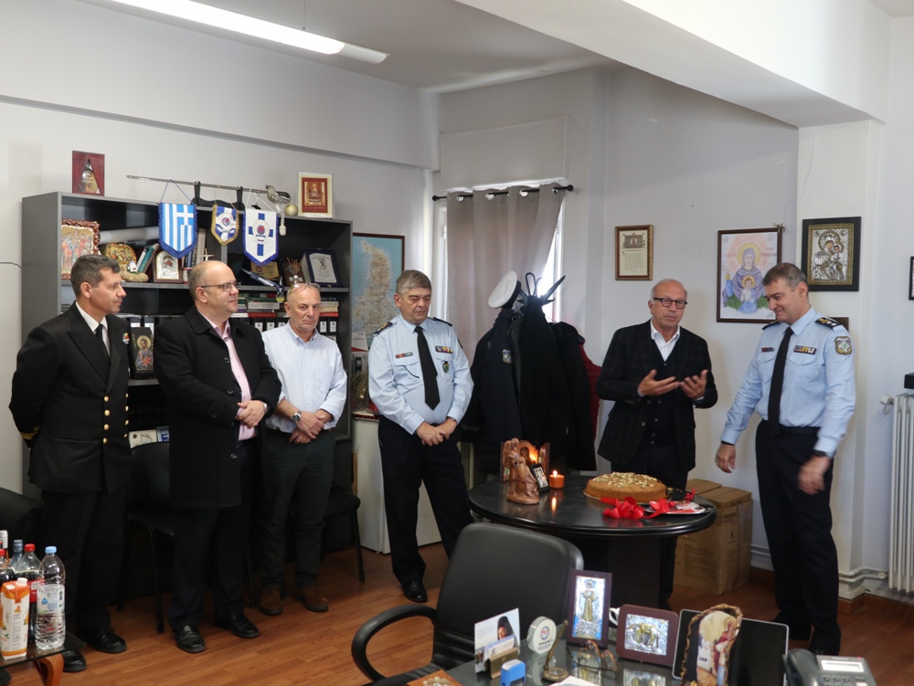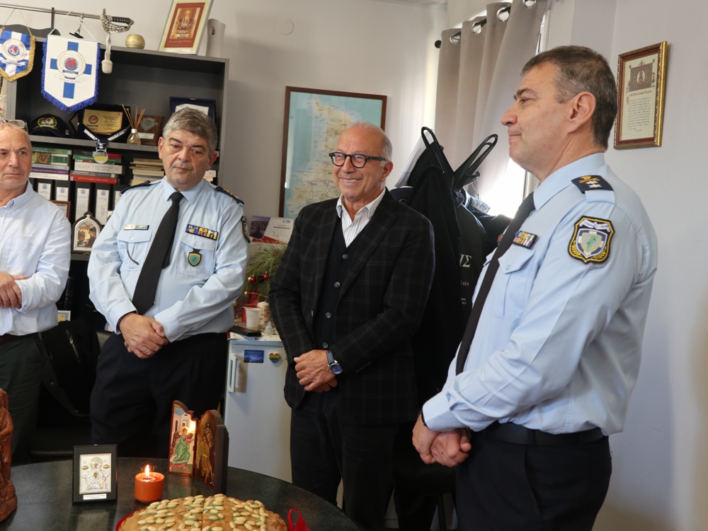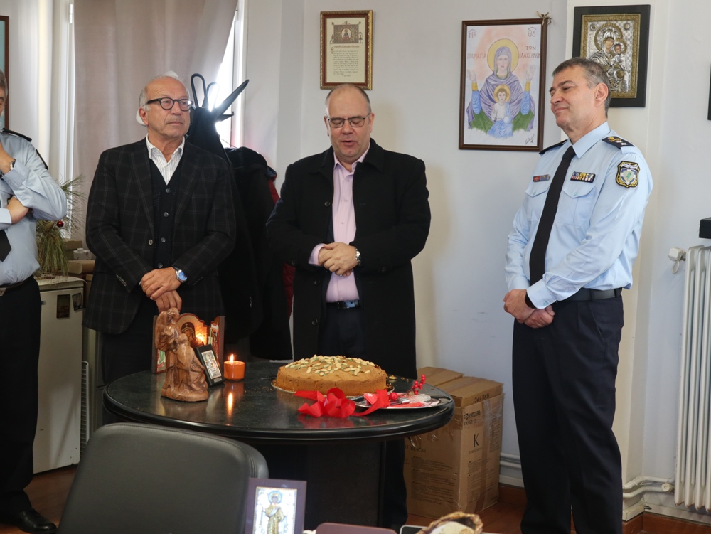 Ύστερα από ευγενή πρόσκληση του Στρατηγού-Περιφερειακού Διευθυντού των Υπηρεσιών της Ελληνικής Αστυνομίας της Περιφέρειας Ν. Αιγαίου κ. Λουκά Θάνου, ο Σεβασμιώτατος κ. Δωρόθεος Β΄ μετέβη στα Γραφεία της Περιφερειακής Διοικήσεως, όπου ευλόγησε την Αγιοβασιλειόπιττα, με την παρουσία του Χωρικού Αντιπεριφερειάρχη Κυκλάδων κ. Γεω. Λεονταρίτη, του Δημάρχου Σύρου-Ερμούπολης κ. Αλεξ. Αθανασίου, του Εισαγγελέως Εφετών Αιγαίου, του Προέδρου του Επιμελητηρίου Κυκλάδων και του Προέδρου του Εργατικού Κέντρου, και ευχήθηκε υπερ του Αρχηγού της ΕΛΑΣ, του Περιφερειακού Αστυνομικού Διευθυντού, του Αστυνομικού Διευθυντού Κυκλάδων κ. Κων, Αγιασοφίτη, των Διευθυντών των Τμημάτων Ασφαλείας, των Αξιωματικών, Στελεχών και εργαζομένων, ανδρών και γυναικών, στα γραφεία της Ελληνικής Αστυνομίας, και τους οποίους ευχαρίστησε γιά την καλή συνεργασία τους και τους συνεχἀρη για το έργο τους και ιδιαίτερα για τον παιδαγωγικό τρόπο, με τον οποίο αντιμετωπίζουν παρεκτρεπομένους και διαφυλάσσουν την έννομη τάξη στη Σύρο και τα νησιά μας.