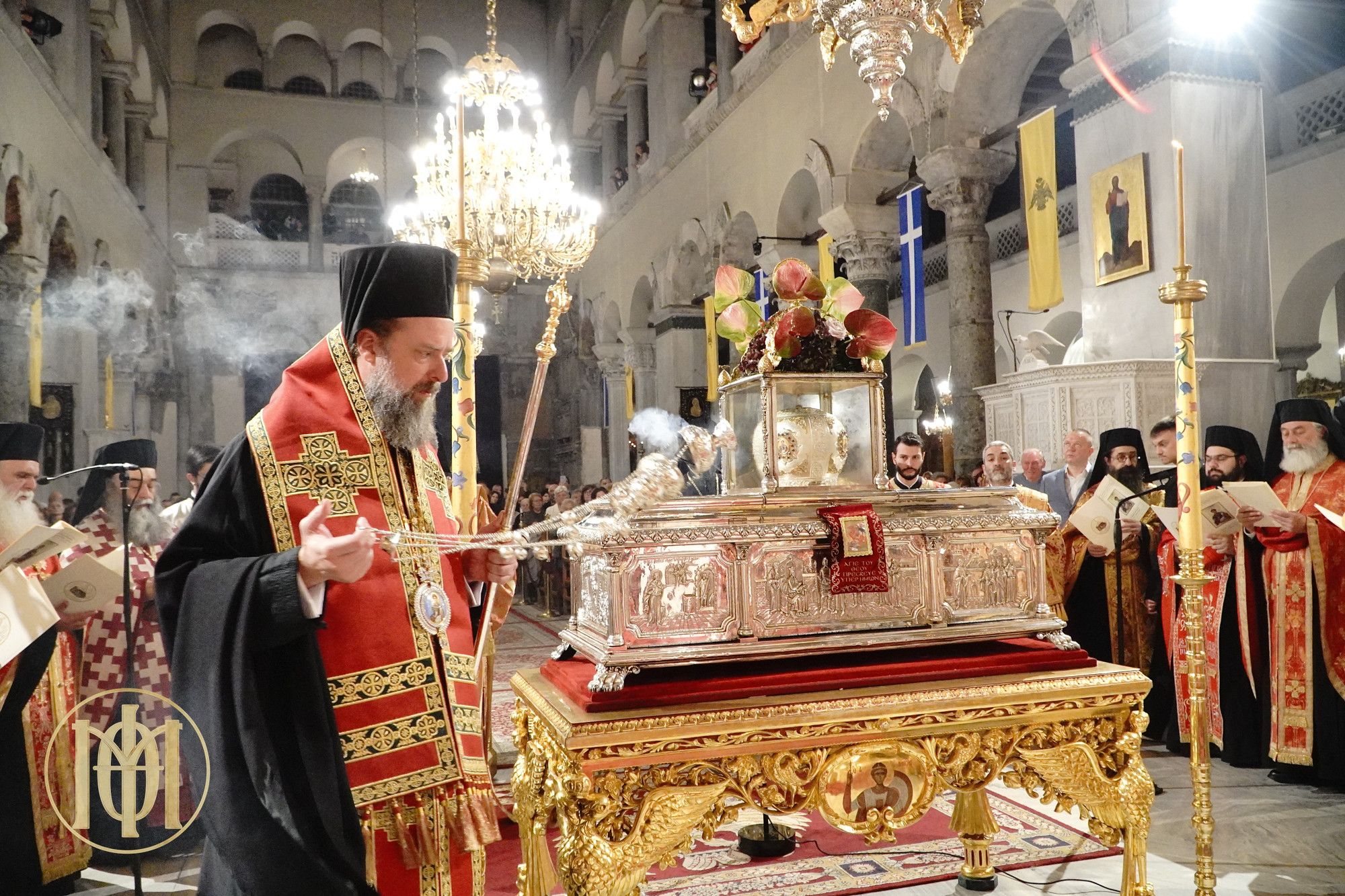 Προ της απολύσεως, ο Μητροπολίτης, εμφανώς συγκινημένος, κατά το κήρυγμά του, αναφέρθηκε στην μεγάλη αγάπη του Αγίου μας για τον Χριστό, ο οποίος δεν δείλιασε μπροστά στα φρικτά μαρτύρια που υπέστη από τους δημίους του για να μαρτυρήσει για τον ίδιο το Χριστό.