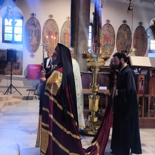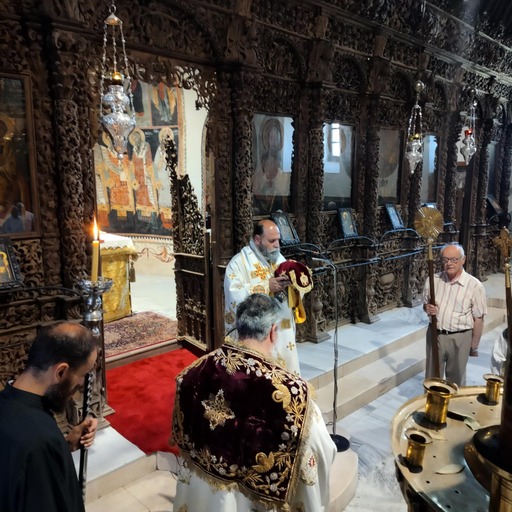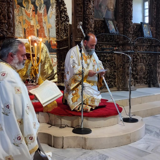 Του Όρθρου χοροστάτησε και προεξήρχε της πανηγυρικής Θείας Λειτουργίας ο Σεβασμιώτατος ποιμενάρχης μας κ.κ. Μάξιμος, πλαισιούμενος από τους ιερείς του ναού π. Σέργιο και π. Λάμπρο. Μετά το πέρας της Θείας Λειτουργίας τελέστηκε κατά το τυπικό η Ακολουθία της Γονυκλισίας, ήτοι ο Εσπερινός της εορτής του Αγίου Πνεύματος.