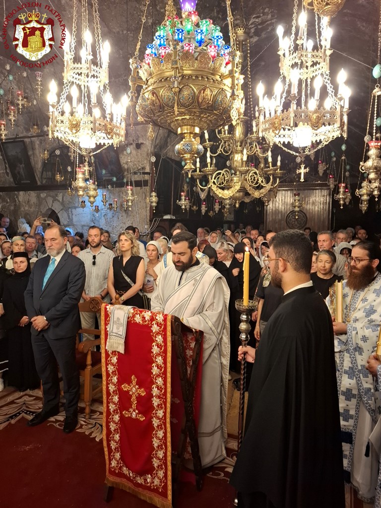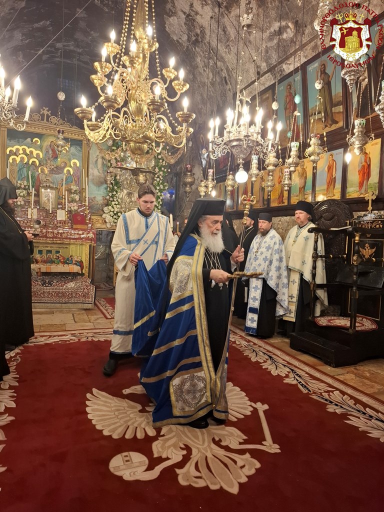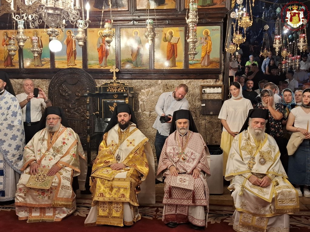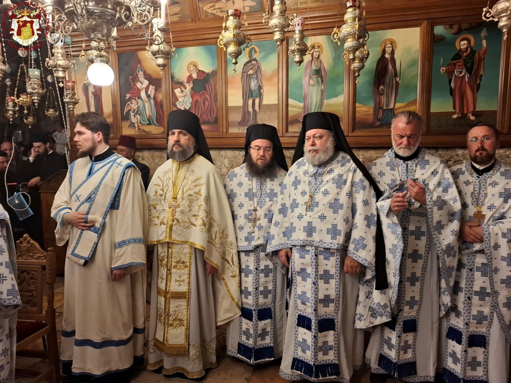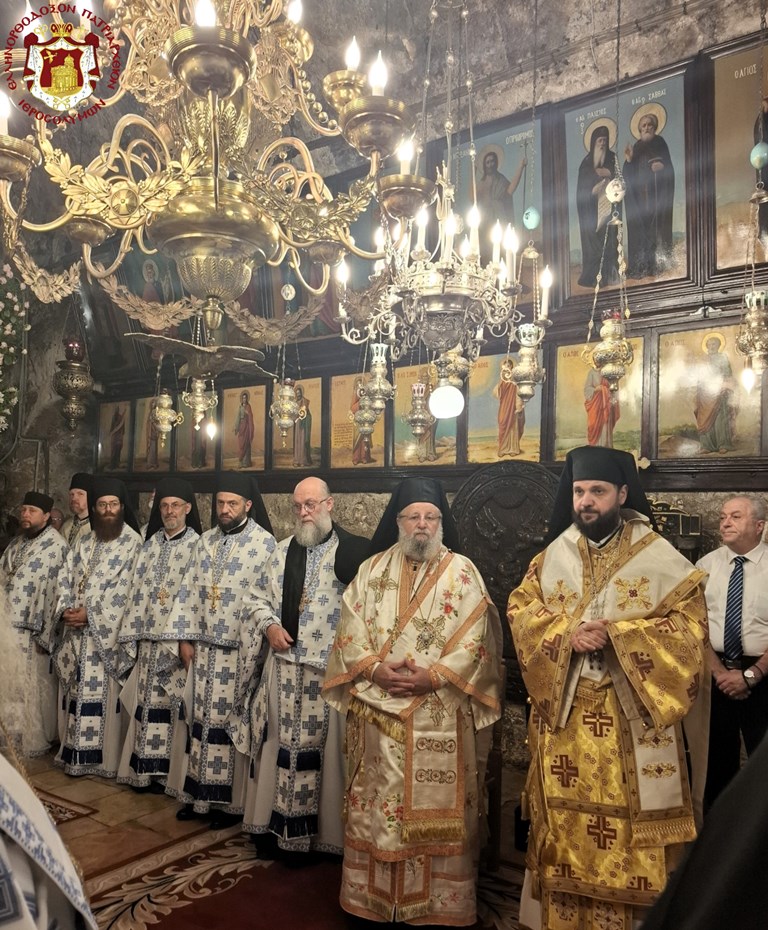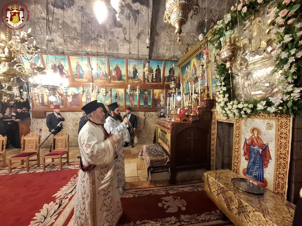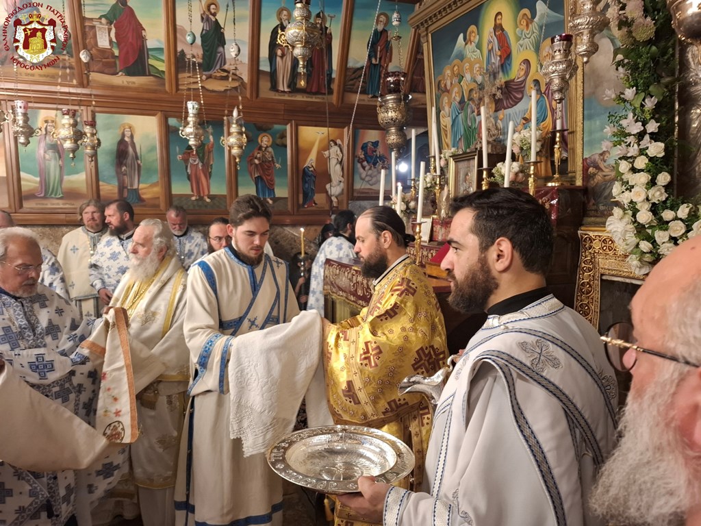 Τήν πρωΐαν ἐτελέσθη Ὄρθρος καί θεία Λειτουργία, τῆς ὁποίας προεξῆρξεν ὁ Πατήρ ἡμῶν καί Πατριάρχης Ἱεροσολύμων κ.κ. Θεόφιλος συλλειτουργούντων τῶν Ἀρχιερέων τοῦ Πατριαρχείου, Σεβασμιωτάτου Μητροπολίτου Καπιτωλιάδος κ. Ἡσυχίου, Σεβασμιωτάτου Μητροπολίτου Βόστρων κ. Τιμοθέου, καί τῶν Σεβασμιωτάτων Ἀρχιεπισκοπων Γεράσων κ. Θεοφάνους, Κωνσταντίνης κ. Ἀριστάρχου, Λύδδης κ. Δημητρίου, Πέλλης κ. Φιλουμένου τοῦ παρεπιδημοῦντος Θεοφιλεστάτου Βοηθοῦ Ἐπισκόπου Τροτουσανούλ κ. Θεοφίλου τοῦ Πατριαρχείου Ρουμανίας, τῶν ἐκπροσώπων Ἀρχιμανδριτῶν τοῦ Πατριαρχείου Μόσχας π. Βασιανοῦ καί τοῦ Πατριαρχείου Ρουμανίας π. Ἰωάννου καί πολλῶν Ἱερομονάχων καί Ἱερέων, τοῦ Ἀρχιδιακόνου π. Μάρκου καί τῶν Ἱεροδιακόνων Εὐλογίου καί Προδρόμου, ψάλλοντος τοῦ Πρωτοψάλτου διακόνου π. Εὐσταθίου καί τῆς Ἀραβικῆς χορῳδίας τοῦ Ναοῦ καί μετέχοντος πιστοῦ εὐλαβοῦς ἐκκλησιάσματος, παρουσίᾳ τοῦ Γενικοῦ Προξένου τῆς Ἑλλάδος εἰς τά Ἱεροσόλυμα κ. Δημητρίου Ἀγγελοσοπούλου.
