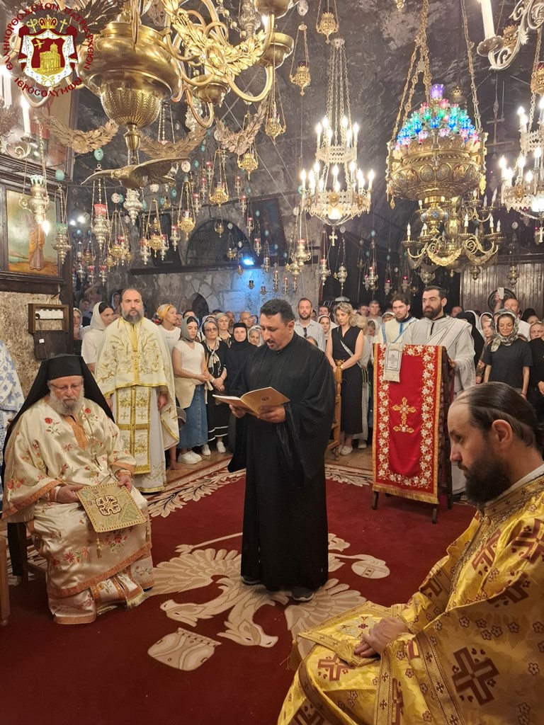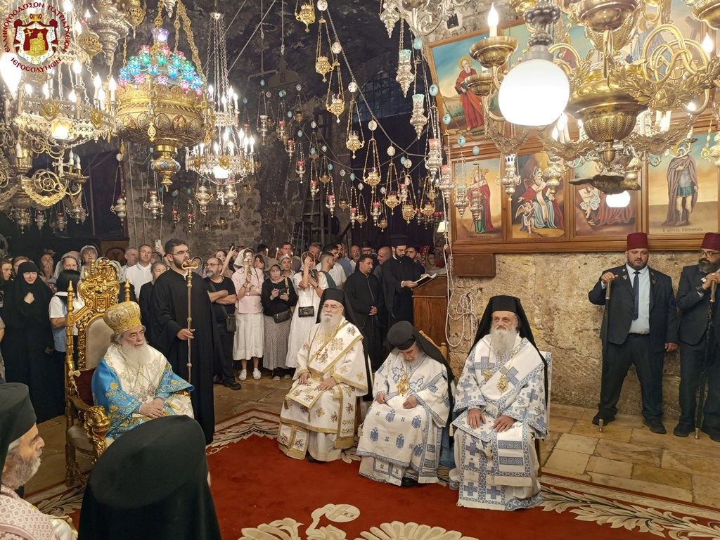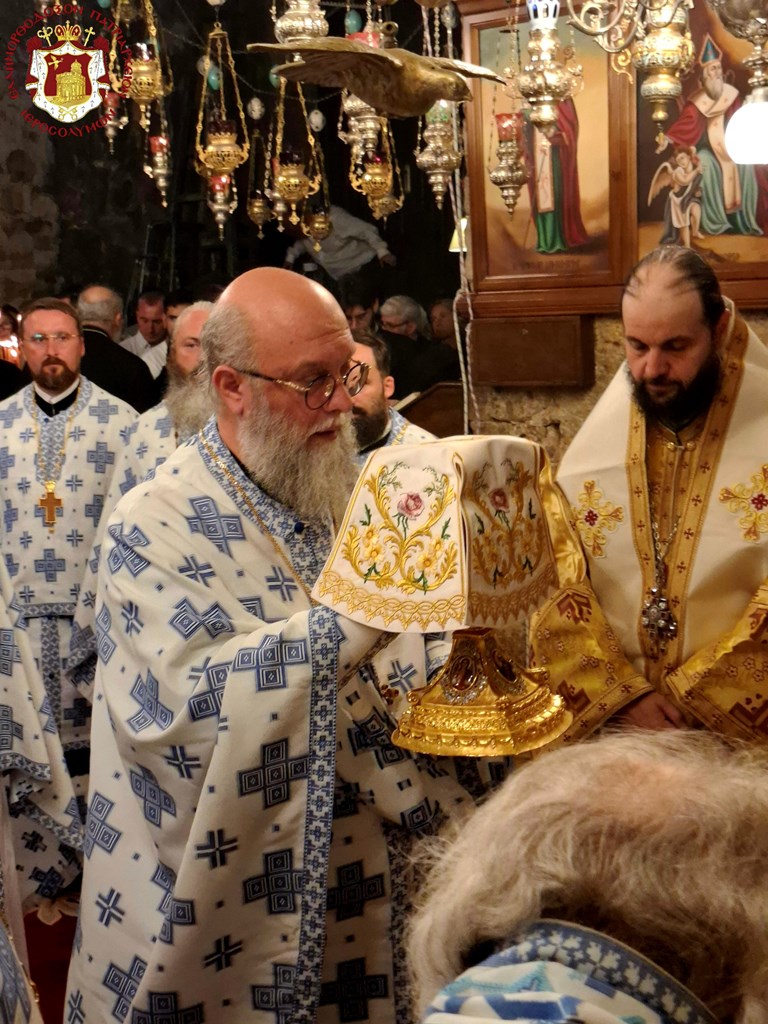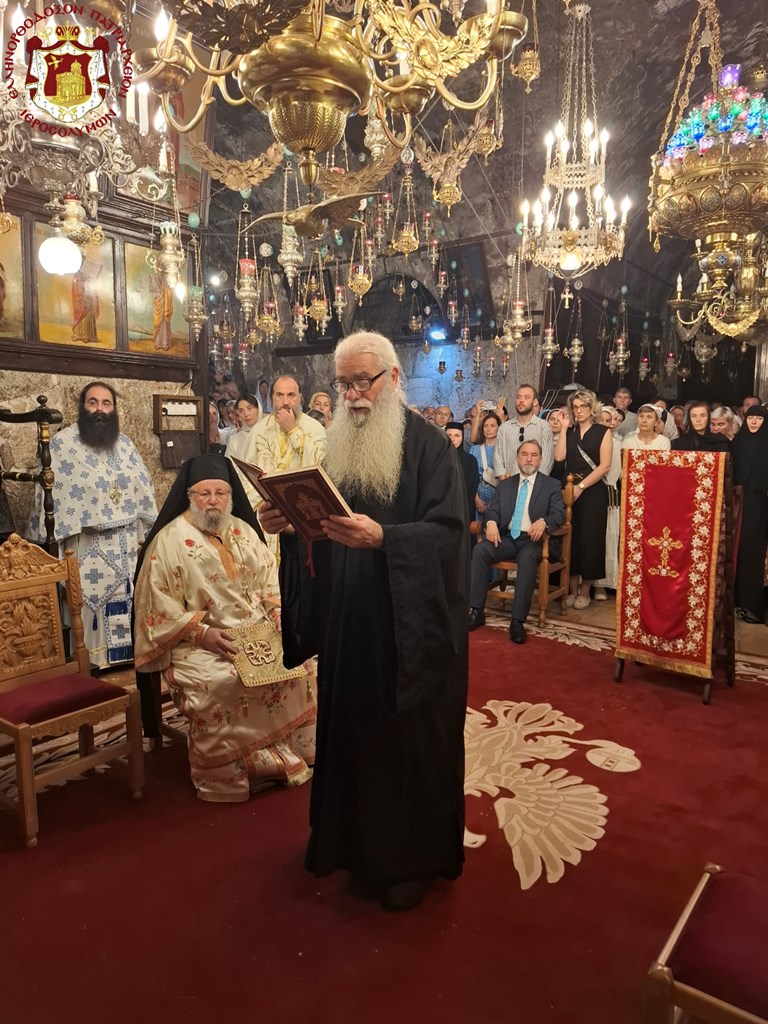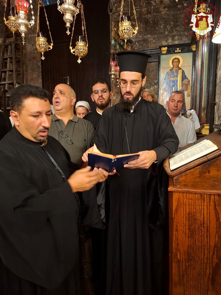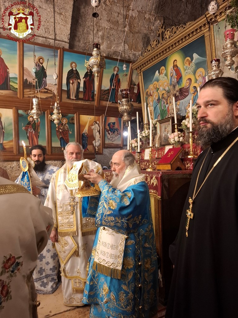 Τήν πρωΐαν ἐτελέσθη Ὄρθρος καί θεία Λειτουργία, τῆς ὁποίας προεξῆρξεν ὁ Πατήρ ἡμῶν καί Πατριάρχης Ἱεροσολύμων κ.κ. Θεόφιλος συλλειτουργούντων τῶν Ἀρχιερέων τοῦ Πατριαρχείου, Σεβασμιωτάτου Μητροπολίτου Καπιτωλιάδος κ. Ἡσυχίου, Σεβασμιωτάτου Μητροπολίτου Βόστρων κ. Τιμοθέου, καί τῶν Σεβασμιωτάτων Ἀρχιεπισκοπων Γεράσων κ. Θεοφάνους, Κωνσταντίνης κ. Ἀριστάρχου, Λύδδης κ. Δημητρίου, Πέλλης κ. Φιλουμένου τοῦ παρεπιδημοῦντος Θεοφιλεστάτου Βοηθοῦ Ἐπισκόπου Τροτουσανούλ κ. Θεοφίλου τοῦ Πατριαρχείου Ρουμανίας, τῶν ἐκπροσώπων Ἀρχιμανδριτῶν τοῦ Πατριαρχείου Μόσχας π. Βασιανοῦ καί τοῦ Πατριαρχείου Ρουμανίας π. Ἰωάννου καί πολλῶν Ἱερομονάχων καί Ἱερέων, τοῦ Ἀρχιδιακόνου π. Μάρκου καί τῶν Ἱεροδιακόνων Εὐλογίου καί Προδρόμου, ψάλλοντος τοῦ Πρωτοψάλτου διακόνου π. Εὐσταθίου καί τῆς Ἀραβικῆς χορῳδίας τοῦ Ναοῦ καί μετέχοντος πιστοῦ εὐλαβοῦς ἐκκλησιάσματος, παρουσίᾳ τοῦ Γενικοῦ Προξένου τῆς Ἑλλάδος εἰς τά Ἱεροσόλυμα κ. Δημητρίου Ἀγγελοσοπούλου.