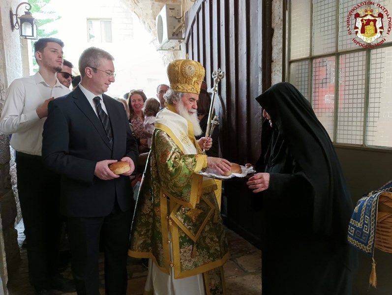 Ἅμα τῇ ἀπολύσει ὁ Μακαριώτατος καί οἱ Ἱερεῖς ἐνδεδυμένοι καί κληρικοί καί λαός συμψάλλοντες ἀνῆλθον εἰς τά Πατριαρχεῖα, λαμβάνοντες κατά τό ἔθος τό ἀρτίδιον εὐλογίας ἐκ τῶν χειρῶν τῆς ἀρτοποιοῦ ἡγουμένης Σεραφείμας ἐν τῇ διαβάσει πρός τήν αἴθουσαν τοῦ Θρόνου.