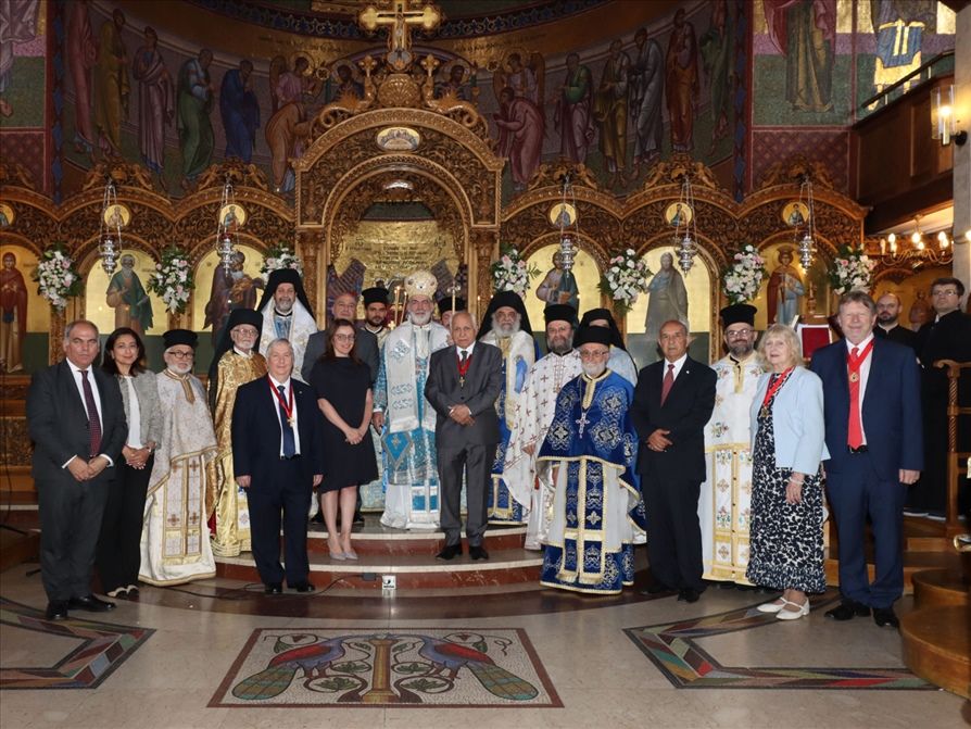 Στο τέλος της Θείας Λειτουργίας, ο Θεοφιλέστατος Επίσκοπος Κλαυδιουπόλεως κ. Ιάκωβος καλωσόρισε θερμά τον Αρχιεπίσκοπο και εξέφρασε την ευγνωμοσύνη του προς τον Άρχοντα κ. Πέτρο Δημητρίου, για τη δωρεά της περίτεχνης ψηφιδωτής εικόνας της Κοιμήσεως της Θεοτόκου. Ως ένδειξη εκτίμησης, απονεμήθηκε στον κ. Δημητρίου αναμνηστικό μετάλλιο για την προσφορά του στην Κοινότητα, ο οποίος με τη σειρά του ανταπέδωσε τις ευχαριστίες προσφέροντας μια εικόνα του Αγίου Νικήτα του Μεγαλομάρτυρος προς τον Αρχιεπίσκοπό κ. Νικήτα.