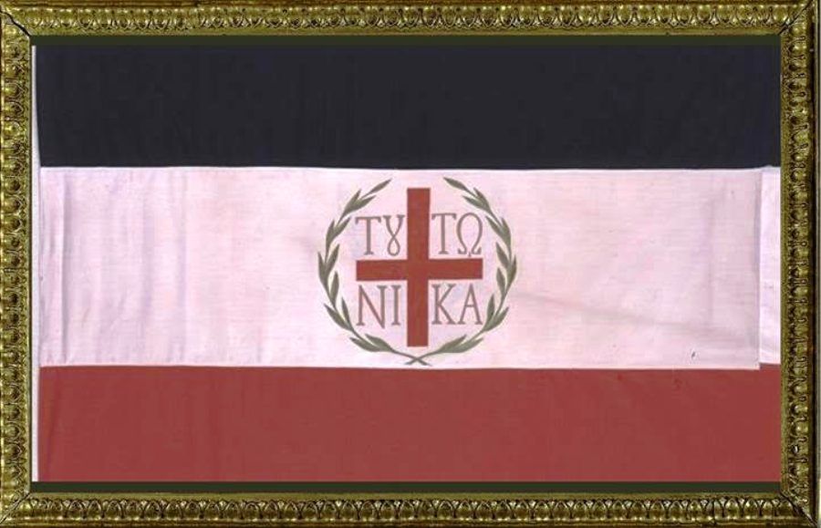 Έπειτα έγινε άξαφνα βαθιά σιωπή. Ορκίστηκαν όλοι για την πατρίδα. Ο Ιεράρχης ευλόγησε τη σημαία. Είχε στο ένα μέρος το σταυρό, το μέγα Κωνσταντίνο και την Ελένη, με την επιγραφή “εν τούτω νίκα” κι από το άλλο το φοίνικα με την επιγραφή: “Από τη στάχτη μου ξαναγεννιέμαι”.