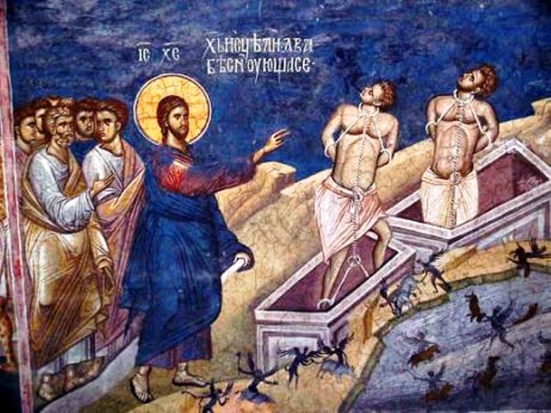 Ο Χριστός διέσχισε τη θάλασσα της Γαλιλαίας και ήλθε στην περιοχή των Γαδαρηνών (ή Γεργεσηνών ή Γερασηνών), απέναντι από την Καπερναούμ. Εκεί συνάντησε και θεράπευσε ένα δαιμονισμένο άνθρωπο,που βρισκόταν σε άθλια κατάσταση λόγω της κατοχής του από πλήθος πονηρών πνευμάτων.Ο ταλαίπωρος εκείνος δεν έμενε σε σπίτι, αλλά στα μνήματα. Τον έδεναν με αλυσίδες, αλλά έσπαγε με υπερφυσική δύναμη τα σιδερένια δεσμά. Κάτω από τη δαιμονική επήρεια πετούσε τα ρούχα του και περιπλανιόταν στην έρημο γυμνός (Κυριακή ΣΤ΄ Λουκά).