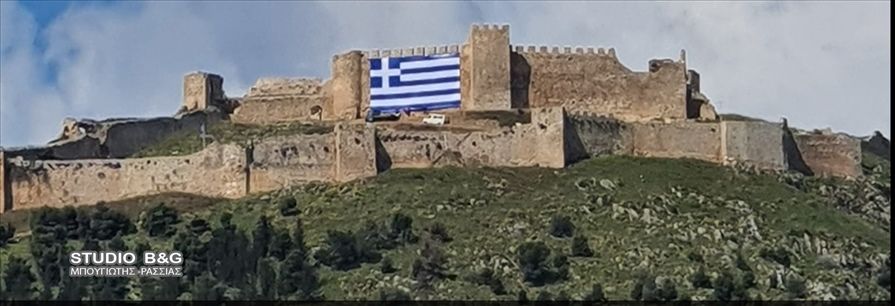 Με μία τεράστια Ελληνική σημαία που τοποθετήθηκε στο κάστρο Λάρισσα στο Αργος από το δήμο Άργους Μυκηνών στα πλαίσια των 200 χρόνων από την Ελληνική Επανάσταση του 1821,Τετάρτη 24 Μαρτίου 2021.