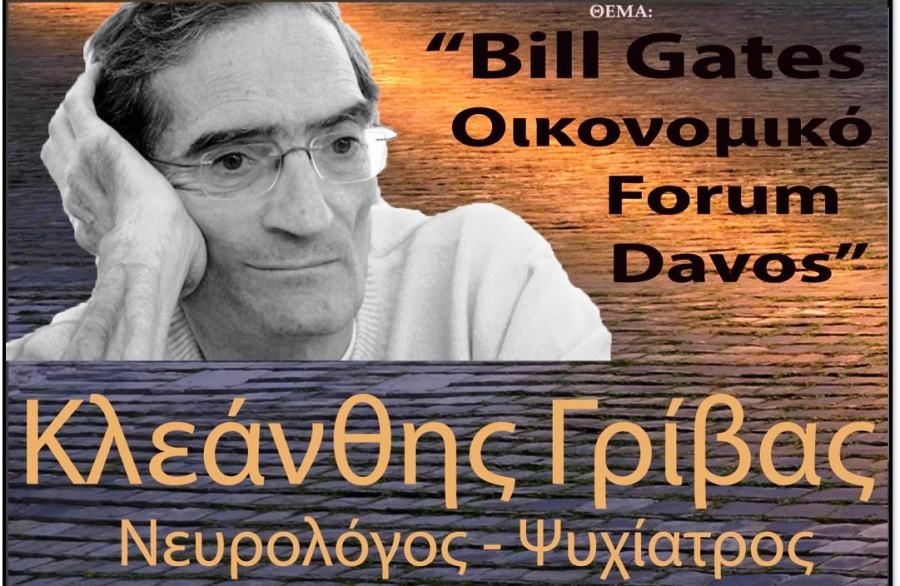 Την Δευτέρα 13 Δεκεμβρίου 2021 στις 20:00 ο γνωστός Νευρολόγος Ψυχίατρος Κλεάνθης Γρίβας θα μιλήσει διαδικτυακά με θέμα: "Bill Gates. Οικονομικό forum Davos". Η εκδήλωση γίνεται σε Συνδιοργάνωση με το Ράδιο Ενημέρωση 92,2.