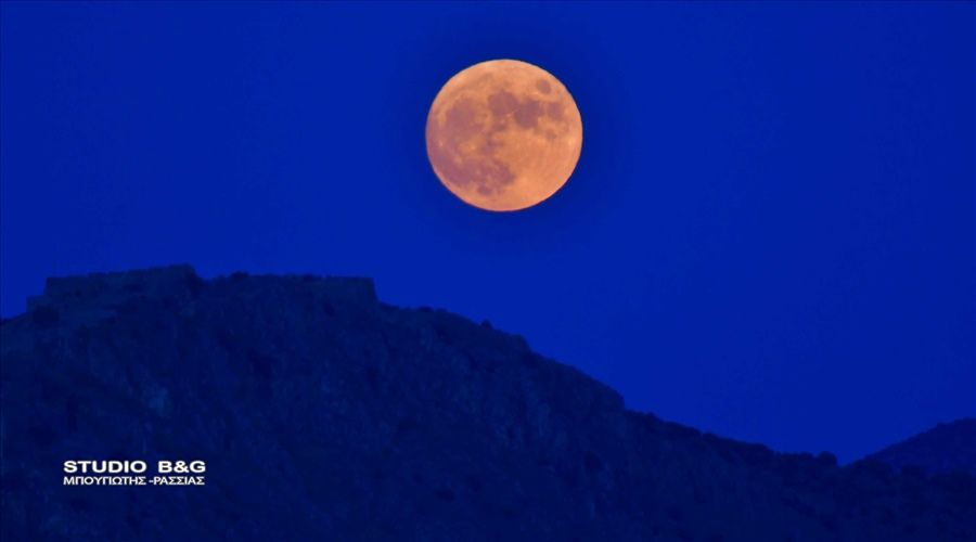 Η πανσέληνος του Ιουλίου ή αλλιώς «το Φεγγάρι του Ελαφιού» ανατέλλει ολόγιομη πάνω από το Ναύπλιο, Παρασκευή 23 Ιουλίου 2021. Η ακριβή ώρα για την πανσέληνο είναι στις 24 Ιουλίου στις 05:36 .