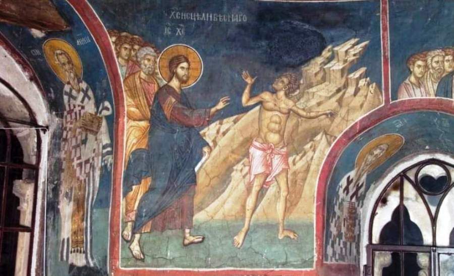 Εκεῖνο τόν καιρό, καθώς ἒφτασε ὁ Ἰησοῦς στήν περιοχή τῶν Γαδαρηνῶν, τόν συνάντησε κάποιος ἄντρας ἀπό τήν πόλη, πού εἶχε μέσα του δαιμόνια ἀπό πολύν καιρό. Ροῦχο δέν ντυνόταν οὔτε ἔμενε σέ σπίτι, ἀλλά ζοῦσε στά μνήματα. Ὅταν εἶδε τόν Ἰησοῦ, ἔβγαλε μία κραυγή, ἔπεσε στά πόδια του καί τοῦ εἶπε μέ δυνατή φωνή: «Τί δουλειά ἔχεις ἐσύ μ΄ ἐμένα Ἰησοῦ, Υἱέ τοῦ ὑψίστου Θεοῦ; Σέ παρακαλῶ μή μέ βασανίσεις». Αὐτά τά εἶπε, γιατί ὁ Ἰησοῦς εἶχε διατάξει τό δαιμονικό πνεῦμα νά βγεῖ ἀπό τόν ἄνθρωπο. Ἀπό πολλά χρόνια τόν εἶχε στήν ἐξουσία του, καί γιά νά τόν συγκρατήσουν τόν ἔδεναν μέ ἁλυσίδες καί τοῦ ἔβαζαν στά πόδια σιδερένια δεσμά. Ἐκεῖνος ὅμως ἔσπαζε τά δεσμά, καί τό δαιμόνιο τόν ὁδηγοῦσε στίς ἐρημιές. Ὁ Ἰησοῦς τόν ρώτησε: «Ποιό εἶναι τό ὄνομά σου;» Ἐκεῖνος ἀπάντησε: «Λεγεών»· γιατί εἶχαν μπεῖ μέσα του πολλά δαιμόνια. Τά δαιμόνια, λοιπόν, τόν παρακαλοῦσαν νά μήν τά διατάξει νά πᾶνε στήν ἄβυσσο. Ἐκεῖ κοντά ἦταν ἕνα κοπάδι ἀπό πολλούς χοίρους πού ἔβοσκαν στό βουνό, καί τά δαιμόνια παρακαλοῦσαν τόν Ἰησοῦ νά τούς ἐπιτρέψει νά μποῦν στούς χοίρους, καί τούς τό ἐπέτρεψε. Βγῆκαν, λοιπόν, ἀπό τόν ἄνθρωπο καί μπῆκαν στούς χοίρους. Τότε τό κοπάδι ὅρμησε πρός τόν γκρεμό καί πνίγηκε στή λίμνη. Μόλις οἱ βοσκοί εἶδαν τί ἔγινε, ἔφυγαν καί τό εἶπαν στήν πόλη καί στήν ὕπαθρο. Βγῆκαν οἱ ἄνθρωποι νά δοῦν τί ἔγινε καί ἦρθαν κοντά στόν Ἰησοῦ. Βρῆκαν τόν ἄνθρωπο ἀπό τόν ὁποῖο βγῆκαν τά δαιμόνια νά κάθεται δίπλα στόν Ἰησοῦ, νά φοράει ροῦχα καί νά φέρεται λογικά, καί φοβήθηκαν. Ὅσοι εἶχαν δεῖ τί εἶχε γίνει, τούς εἶπαν γιά τό πώς ὁ δαιμονισμένος σώθηκε. Τότε ὅλο τό πλῆθος ἀπό τήν περιοχή τῶν Γαδάρων παρακαλοῦσαν τόν Ἰησοῦ νά φύγει ἀπό κοντά τους, γιατί τούς εἶχε πιάσει μεγάλος φόβος. Ἐκεῖνος μπῆκε στό πλοιάριο γιά νά γυρίσει πίσω. Ὁ ἄνθρωπος ἀπό τόν ὁποῖο εἶχαν βγεῖ τά δαιμόνια τόν παρακαλοῦσε νά τόν πάρει μαζί του. Ὁ Ἰησοῦς ὅμως τοῦ εἶπε νά φύγει, μέ τά παρακάτω λόγια: «Γύρισε στό σπίτι σου καί διηγήσου ὅσα ἔκανε σ΄ ἐσένα ὁ Θεός». Ἐκεῖνος ἔφυγε διαλαλώντας σ΄ ὅλη τήν πόλη ὅσα ἔκανε σ΄ αὐτόν ὁ Ἰησοῦς.