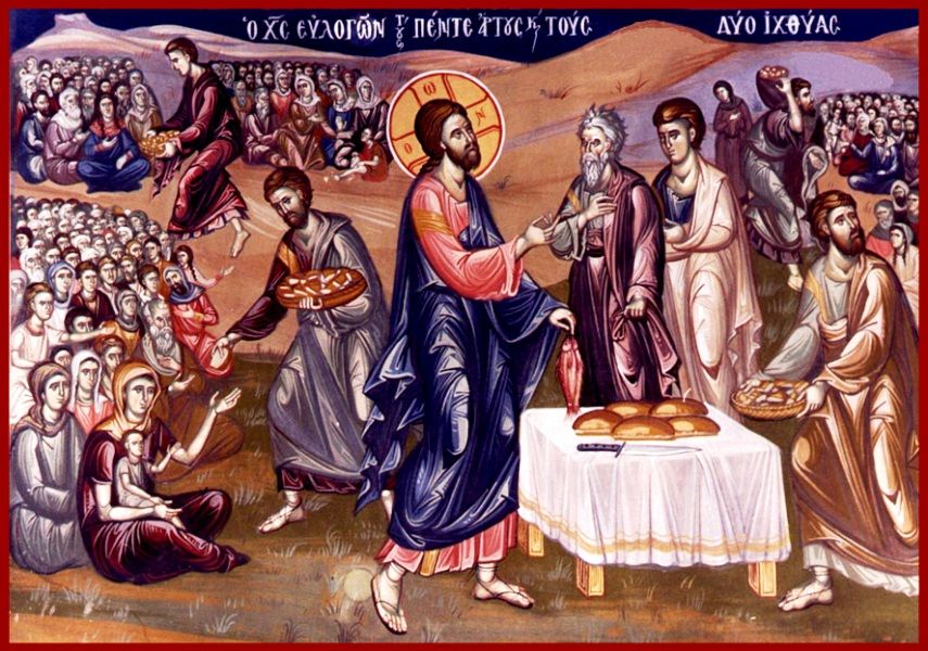 Σέ μία ἀπό τίς πιό ἀνθρώπινες στιγμές τῆς ἐπιγείου δράσης του, ἀγαπητοί μου ἀδελφοί, ὁ Χριστός θά πάρει στά χέρια του πέντε ἄρτους καί δύο ἰχθύας καί «ἀναβλέψας εἰς τόν οὐρανόν» (Ματθ. 14, 19) θά εὐλογήσει καί θά κάνει νά τραφοῦν δι’ αὐτῶν πέντε χιλιάδες ἄνδρες, καθώς καί γυναῖκες καί παιδιά πού τόν ἄκουγαν ἐπί μία μέρα στήν ἔρημο!