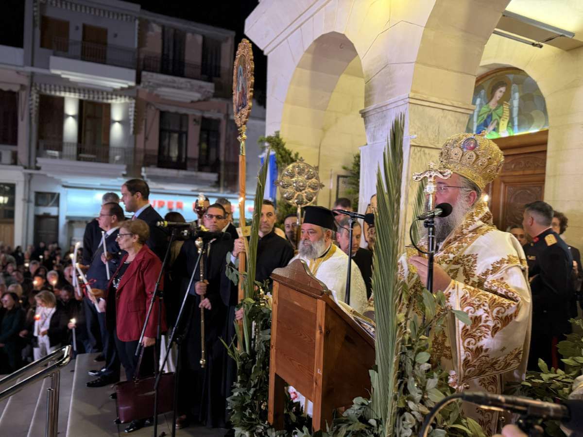 Στη συνέχεια, ο Σεβασμιώτατος, στα προπύλαια του Ιερού Ναού, με την παρουσία εκατοντάδων πιστών, εξήγγειλε τον γλυκύφθογγο παιάνα «Χριστός Ανέστη» και ευχήθηκε προς όλους πλούσια τη χάρη και ευλογία του Αναστάντος Κυρίου και της Αναστάσεως που έρχεται να γίνει προσωπικό γεγονός στη ζωή καθενός ανθρώπου.