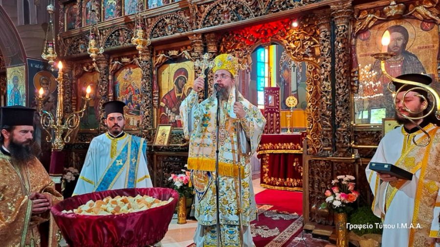 Χοροστάτησε στην ακολουθία του Όρθρου και προεξήρχε στην πανηγυρική Θεία Λειτουργία, κατά την απόλυση της οποίας απένειμε το οφφίκιο του Πρωτοπρεσβυτέρου στον Προϊστάμενο του Ναού, π. Θεόδωρο Ζήση.