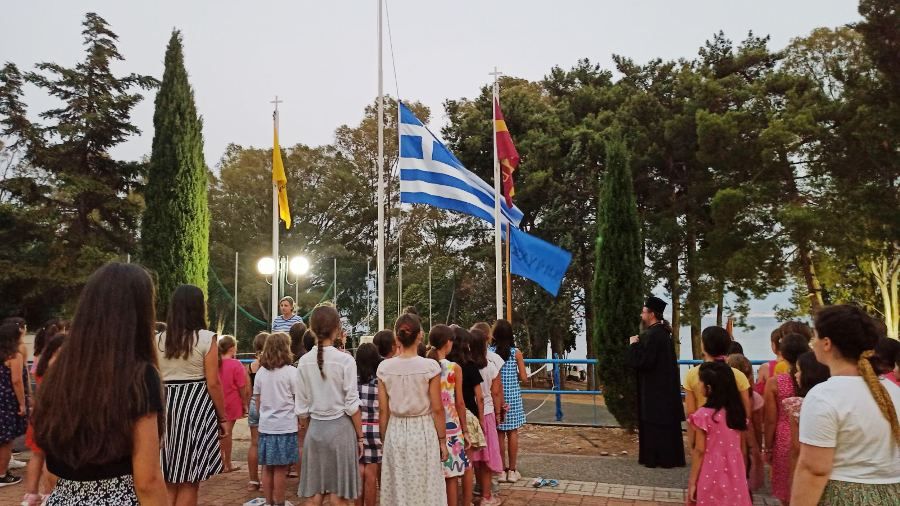 Η Αρχηγός κ. Δήμητρα Λιάγκα – Αναγνωστού, τα στελέχη και οι μικρές κατασκηνώτριες επεφύλαξαν θερμή υποδοχή στον Ποιμενάρχη τους, με ένα νησιώτικο τραγούδι. Ο Σεβασμιώτατος, με πατρική αγάπη, μίλησε στις 110 κατασκηνώτριες, λαμβάνοντας αφορμές από την γενική ονομασία της Κατασκήνωσης, που είναι «Ακρογυάλι Χριστού», τις ονομασίες των οχτώ ομάδων και τους προστάτες Αγίους τους. Τόνισε κυρίως την ανάγκη να παραμένουν γενναίες στη ζωή τους, η οποία θα έχει πολλές φουρτούνες, αλλά όταν έχουν συνοδοιπόρο τον Χριστό, μαζί με την πίστη, τις αρχές και τα χαρίσματά τους πάντοτε θα είναι νικήτριες. Υπογράμμισε την ανάγκη να είναι αποφασιστικές, σταθερές και ανυποχώρητες στα θέματα της πίστεως, να ομολογούν τον Χριστό, δείχνοντας αγάπη σε κάθε άνθρωπο, να καλλιεργούν την αγάπη στο Χριστό και στους ανθρώπους που είναι η κορυφαία αρετή και να αγωνίζονται στη ζωή τους με πρότυπο τους Αγίους που έχουν ως προστάτες τους.