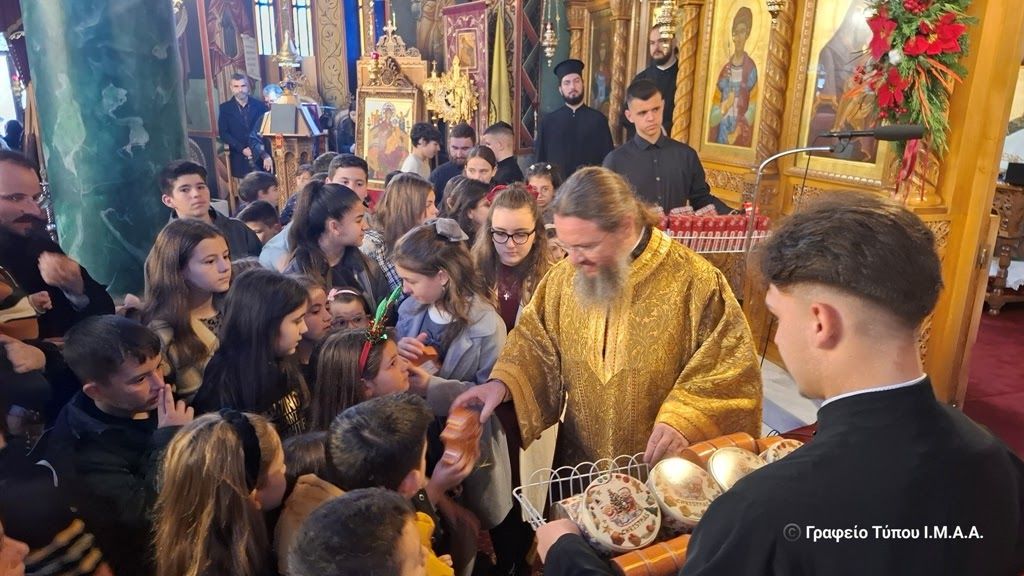 Αμέσως μετά τα παιδιά των Κατηχητικών Σχολείων της Ενορίας έψαλλαν τα παραδοσιακά κάλαντα στον Σεβασμιώτατο, ο οποίος τα ευλόγησε και τους μοίρασε αναμνηστικά δώρα.