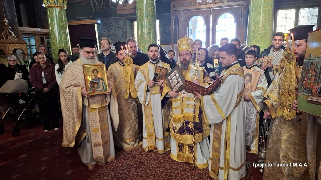 Πριν την απόλυση της Θείας Λειτουργίας, ο Σεβασμιώτατος προεξήρχε της λιτανεύσεως των ιερών Εικόνων εντός του Ναού, κατά την τάξη της Εκκλησίας και ανέγνωσε τις διατεταγμένες περικοπές εκ του Συνοδικού της Εβδόμης Οικουμενικής Συνόδου.