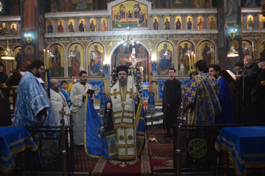 Ο Σεβασμιώτατος έψαλλε τους Οίκους ενώπιον της εικόνας της Θεοτόκου, συμπαραστατούμενος από τον ιεροκήρυκα αρχιμ. Μακάριο Αντωνόπουλο, τον π. Βασίλειο Λιάκο, Προϊστάμενο του Ναού, τον π. Ηλία Λιάκο, τον Συνταξιούχο πρώην Εφημέριο του Ναού, πρωτοπρ. Κωνσταντίνο Σαράκη και τους διακόνους π. Στέφανο Καππέ, π. Αμβρόσιο Καλλιάφα και π. Δημήτριο Λαγούδη. Τους ύμνους της Ακολουθίας απέδωσαν ο Πρωτοψάλτης κ. Χριστόφορος Κοκορόσκος και ο Λαμπαδάριος κ. Ιωάννης Σιδέρης.