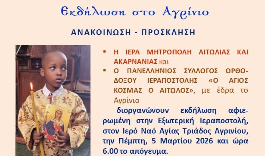 Η Ιερά Μητρόπολη Αιτωλίας και Ακαρνανίας και ο Πανελλήνιος Σύλλογος Ορθοδόξου Ιεραποστολής «Ο Άγιος Κοσμάς ο Αιτωλός», με έδρα το Αγρίνιο διοργανώνουν εκδήλωση αφιερωμένη στην Εξωτερική Ιεραποστολή, στο Αγρίνιο, στον Ιερό Ναό Αγίας Τριάδος, την Πέμπτη 5 Μαρτίου 2026 και ώρα 18:00’ το απόγευμα.