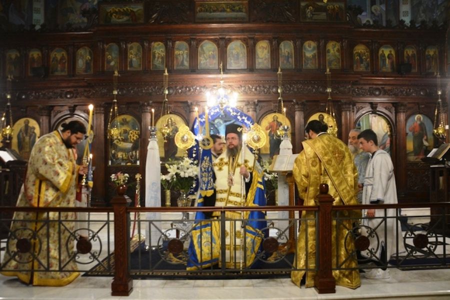 Ο Σεβασμιώτατος έψαλλε την Α’ και Δ’ Στάση των Χαιρετισμών της Θεοτόκου, ενώπιον της ιεράς Εικόνας της, συμπαραστατούμενος από τον Πρωτοσύγκελλο, αρχιμ. Θεόκλητο Ράπτη, ο οποίος έψαλλε την Β’ και Γ’ Στάση των Χαιρετισμών, τον Αρχιδιάκονο π. Στέφανο Καππέ και τους Διακόνους π. Αμβρόσιο Καλλιάφα και π. Δημήτριο Λαγούδη.