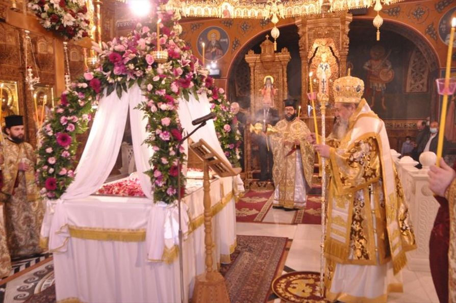 Τήν Μεγάλη Παρασκευή τό ἀπόγευμα τήν ἀκολουθία τοῦ Ἐπιταφίου, λιτανεύοντας τόν Ἐπιτάφιο γύρω ἀπό τόν Ἱερὀ Ναό.