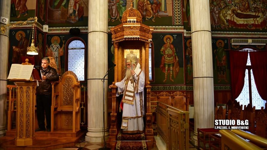 Η Θεία Λειτουργία τελέσθηκε από τον Μητροπολίτη Αργολίδας Νεκτάριο σε μια εντελώς άδεια από κόσμο εκκλησία, λόγω των εκτάκτων μέτρων για την αποφυγή διάδοσης του κορονοϊού.