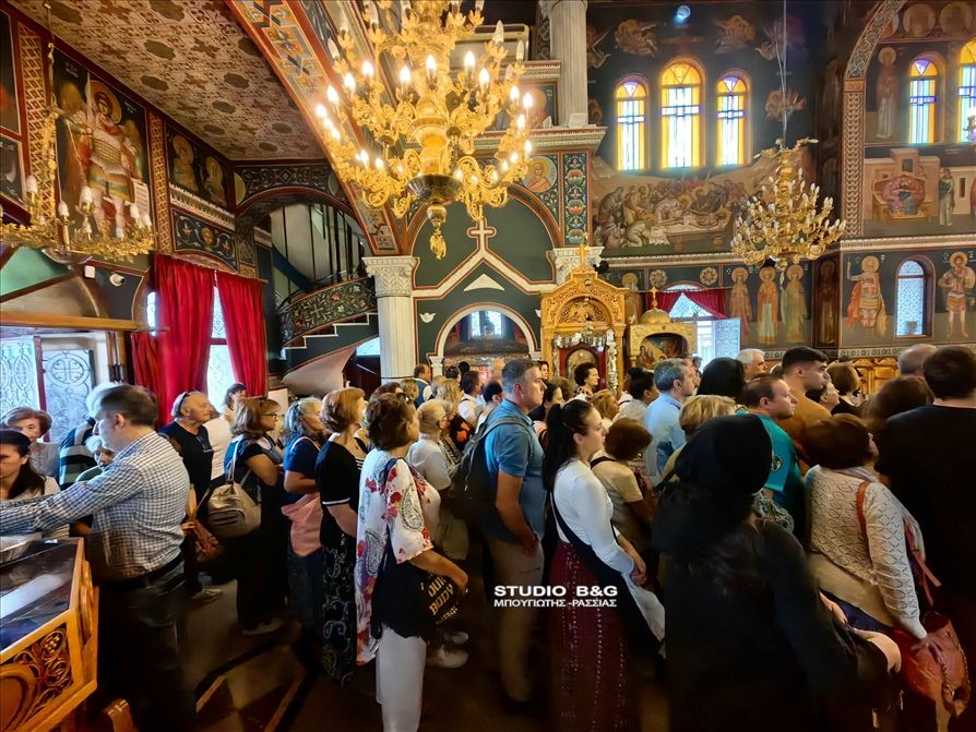 Πλήθος προσκυνητών που καταφθάνουν με λεωφορεία απ' όλη την Ελλάδα κατακλύζουν τον Ι.Ν. της Ευαγγελίστριας Ναυπλίου για να προσκυνήσουν το ιερό λείψανο της Αγίας Άννης που φιλοξενείται στον ναό από τη Μονή Κουτλουμουσίου του Αγίου Όρους.