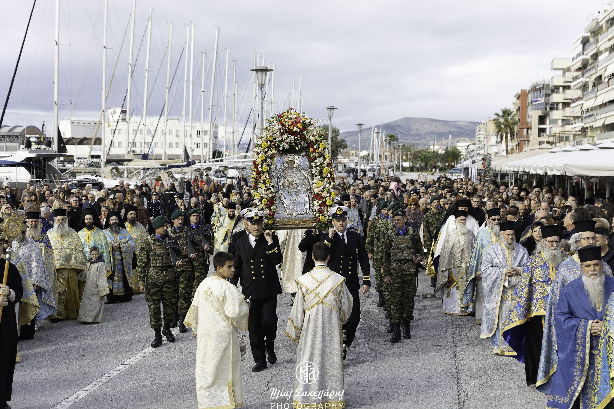 Ακολούθησε η λιτάνευση της Ιεράς Εικόνος και του Ιερού Λειψάνου του Αγίου Νικολάου, καθώς και της Ιεράς Εικόνος της Παναγίας Εικονιστρίας στους δρόμους της πόλης, υπό τους ήχους της Φιλαρμονικής του Δήμου Βόλου, συνοδεία στρατιωτικού αγήματος, όπου τελέστηκε η αρτοκλασία και ο Σεβ. Μητροπολίτης μας κ. Ιγνάτιος απηύθυνε εόρτιο χαιρετισμό. Ευχαρίστησε τον προσκεκλημένο Ιεράρχη για την ευλογητή συμμετοχή του στην πανήγυρή μας· εξήρε την παρουσία της Ιεράς Εικόνος της Παναγίας Εικονιστρίας από την Σκιάθο και απέστειλε τις θερμές του ευχαριστίες στον Σεβ. Μητροπολίτη Χαλκίδος κ. Χρυσόστομο, που έδωσε την άδεια για την μεταφορά της στον τόπο μας. Αναφέρθηκε στους κορυφαίους θεσμούς που λειτουργούν υπό την ευθύνη της Τοπικής μας Εκκλησίας, στον χώρο της Υγείας, με το Άτυπο Δίκτυο Λειτουργών Υγείας, όπου συμμετέχουν δεκάδες σχετικών φορέων, στον χώρο του Πολιτισμού, με την «Μαγνήτων Κιβωτό», που διασώζει και αναδεικνύει το πολιτιστικό απόθεμα της Μαγνησίας και στον χώρο της Θεολογίας και του Διαχριστιανικού Διαλόγου, με την Ακαδημία Θεολογικών Σπουδών. Θύμισε την ενότητα του λαού μας, σε δύσκολες περιόδους, με την καθοριστική συμβολή της Εκκλησίας μας, όπως κατά την μακρά οικονομική κρίση και την εποχή των μεγάλων φυσικών καταστροφών. Ειδική και δυναμική αναφορά έκανε ο Ποιμενάρχης μας στην θάλασσα, που μας περιβάλλει: «έχουμε ενώσει τις δυνάμεις μας, για να διασώσουμε τον όμορφο Παγασητικό κόλπο. Θέλουμε να τον κρατήσουμε ζωντανό και καθαρό και δεν πρέπει να επιτρέψουμε οτιδήποτε θα προκαλέσει μόλυνση και καταστροφή. Αυτό που διακηρύσσεται υπέρ του περιβάλλοντος, πρέπει να τηρείται. Χρειάζονται προληπτικά μέτρα, για να αποτραπεί η μόλυνση της θάλασσας και του ευρύτερου φυσικού περιβάλλοντός μας».