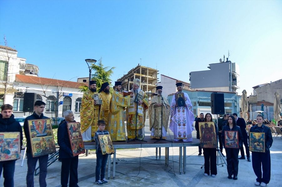 Αμέσως μετά ακολούθησε η λιτανευτική περιφορά των Ιερών Εικόνων, η οποία κατέληξε στην κεντρική πλατεία του Τυρνάβου, όπου ο Σεβασμιώτατος ευχαρίστησε τον Δήμο Τυρνάβου για την διοργάνωση της όλης τελετής, τη φιλαρμονική του Δήμου, τον Σύνδεσμο εφέδρων αξιωματικών, αλλά και την εφορία αρχαιοτήτων τόσο στο πρόσωπο της απελθούσας προϊσταμένης Εριτιμου κ. Σταυρούλας Σδρόλια, όσο και στο πρόσωπο του νέου προϊσταμένου, αξιότιμου κ. Γεωργίου Τουφεξή. Η προσευχητική κατάνυξη ήταν το κυρίαρχο συναίσθημα, ενώ και η χαρά στα πρόσωπα μεγάλων και μικρών από την ξεχωριστή αυτή η μέρα στον ηλιόλουστο Τύρναβο ήταν προφανής. Ο Σεβασμιώτατος ευχήθηκε να αξιοποιήσουμε την Αγία και Μεγάλη Τεσσαρακοστή ως πορεία μετανοίας, και να φτάσουμε να γιορτάσουμε την λαμπροφόρο Ανάσταση του Κυρίου και Θεού και Σωτήρος ημών Ιησού Χριστού.