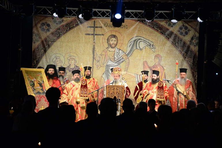 Στον περικαλλή Ναό του Αποστόλου Ανδρέου προέστη της τελετής της Αναστάσεως, με την συμμετοχή απείρου πλήθους, ο Σεβασμιώτατος Μητροπολίτης Πατρών κ.κ. Χρυσόστομος, ο οποίος απηύθυνε εγκάρδιον χαιρετισμό και Αναστάσιμο ασπασμό στάπλήθη των ευσεβών Χριστιανών και εκάλεσε όλους νά προσευχηθούν για την κατάπαυση των πολέμων στήν Μέση Ανατολή και στον Βορρά, που βάφουν με αίμα την γη, άδικα.