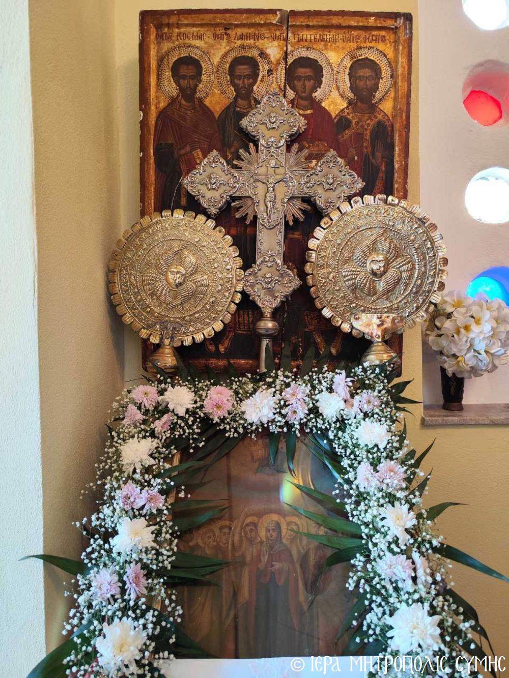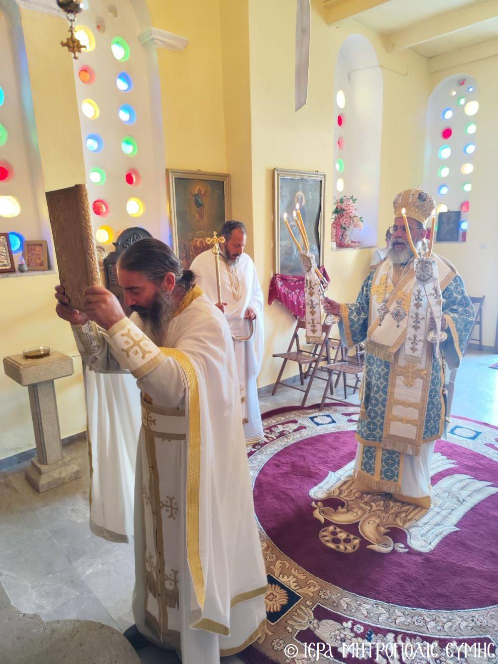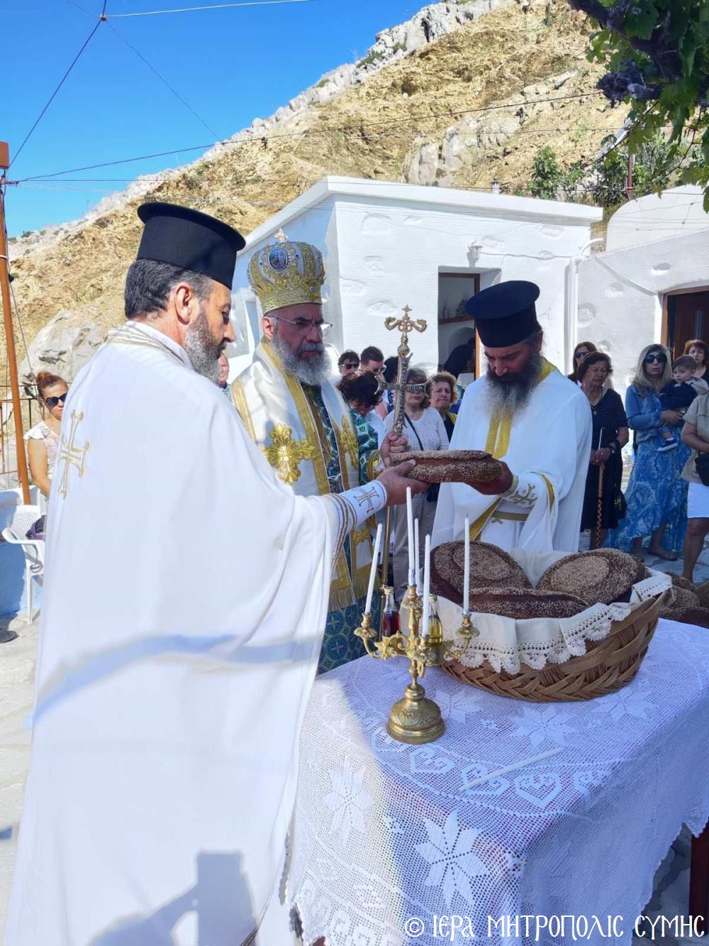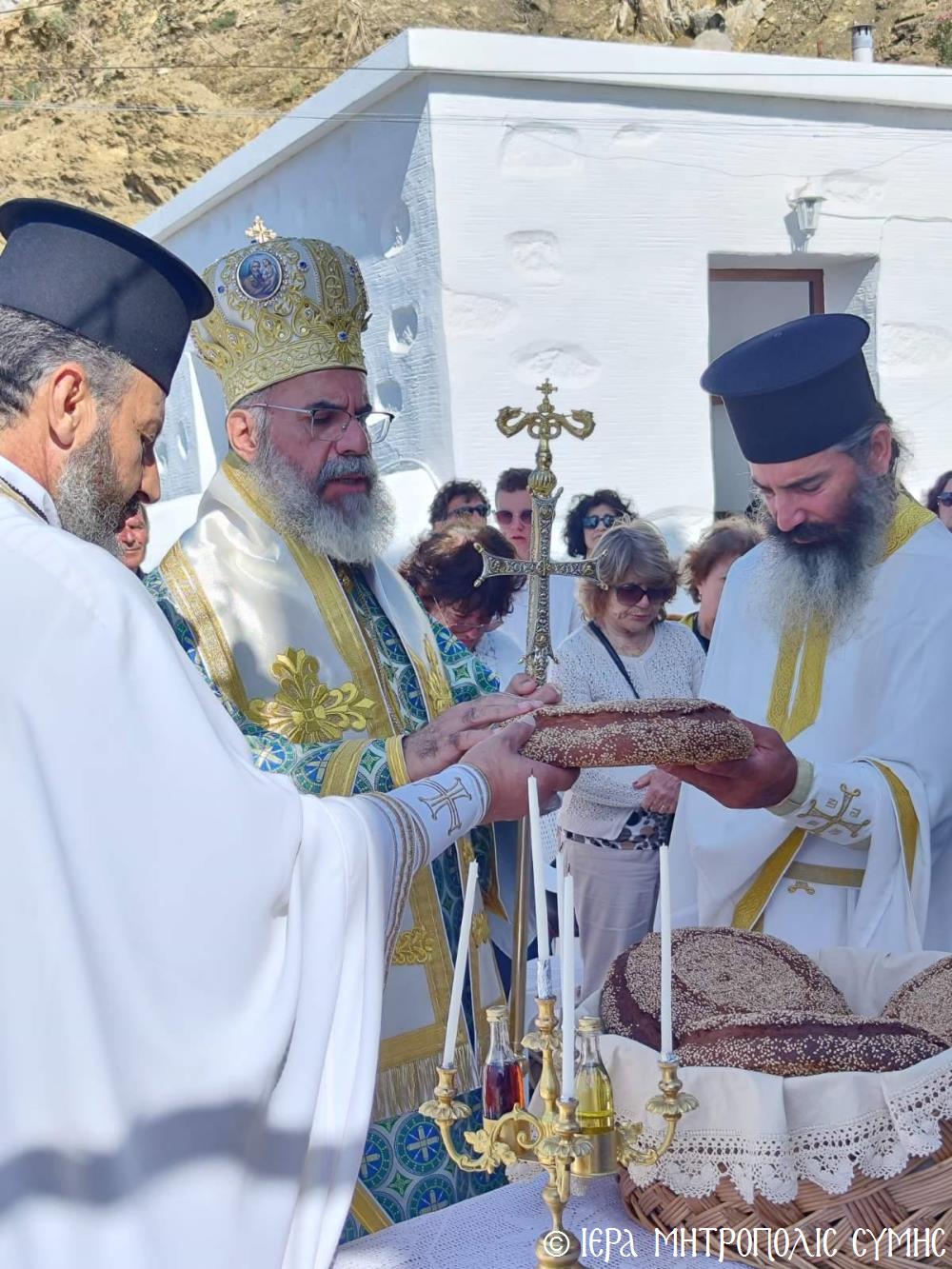 Ὁ Σεβασμιώτατος, ὁ ὁποῖος κήρυξε καί τόν θεῖο λόγο ἀναλύων τά ὑψηλά νοήματα τῆς Ἑορτῆς, μετά τήν Θ. Λειτουργία προέστη τῆς Λιτανείας τῆς ἱ. Εἰκόνος καί ἐν συνεχείᾳ εὐλόγησε τούς προσφερομένους Ἄρτους. Μετά τό πέρας, ἡ φιλόξενη Ἐπιτροπή τοῦ Ἱ. Ναοῦ προσέφερε καφέ καί τά καθιερωμένα ἑόρτια κεράσματα στούς συμμετέχοντες πιστούς, ὥστε ἡ πνευματική χαρά νά διοχετευθεῖ καί στήν διαπροσωπική ἐπαφή καί ἐπι-κοινωνία τῶν ἀνθρώπων.