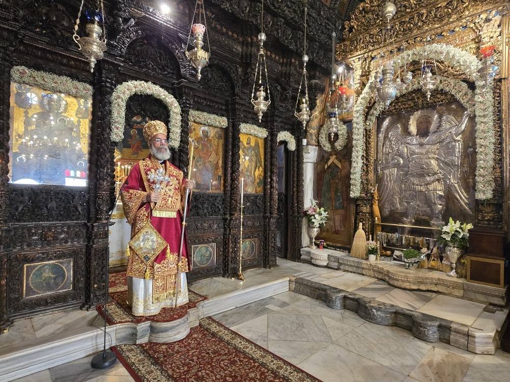 Ἡ ἑσπερινή Ἀκολουθία ἐτελέσθη εἰς τό Καθολικό τοῦ Ταξιάρχου, μετά τῆς Λιτῆς, κατά τήν διάρκεια τῆς ὁποίας πραγματοποιήθηκε ἡ περιφορά τῆς ἱ. Εἰκόνος τῆς Πεντηκοστῆς καί ἐτελέσθη ἡ Ἀρτοκλασία. Πρό τῆς ἀπολύσεως, ὁ Σεβασμιώτατος Ποιμενάρχης μας, ὁμίλησε θεολογικότατα εἰς τούς εὐλαβεῖς προσκυνητάς περί τοῦ γεγονότος τῆς Πεντηκοστῆς καί τῆς Ἐπιφοιτήσεως τοῦ Ἁγίου Πνεύματος, τό Ὁποῖον "ὅλον συγκροτεῖ τόν θεσμόν τῆς Ἐκκλησίας" .