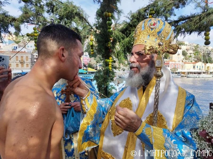 Ἀκολούθως ὁ Σεβασμιώτατος ἐπικεφαλῆς τοῦ Ἱεροῦ Κλήρου, τῶν τοπικῶν Ἀρχόντων καί τοῦ πιστοῦ λαοῦ πορεύθηκε κατά τό ἔθος στό γειτνιάζον γραφικό λιμάνι τῆς Σύμης, ὅπου τέλεσε τήν κατάδυση τοῦ Τιμίου Σταυροῦ καί τόν καθαγιασμό τῶν ὑδάτων. Πολλοί ἦσαν οἱ τολμηροί πού βούτηξαν στά παγωμένα νερά προκειμένου νά ἀνασύρουν τόν Τίμιο Σταυρό καί νά λάβουν τήν Θεία εὐλογία στήν ζωή τους. Τελικά ἐκεῖνος πού τά κατάφερε ἦταν ὁ νεαρός Ἐλευθέριος Φραζαδάκης, στόν ὁποῖο ὁ Μητροπολίτης μας προσέφερε ὡς εὐλογία καί ἀνάμνηση, χρυσό ἐπιστήθιο σταυρό.