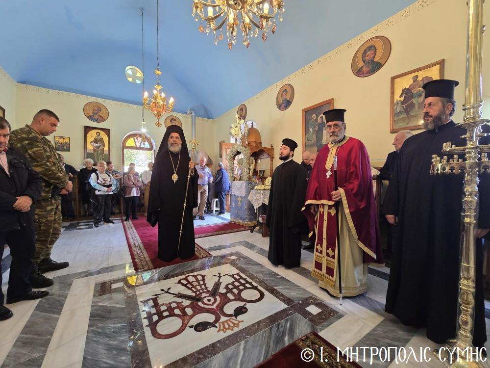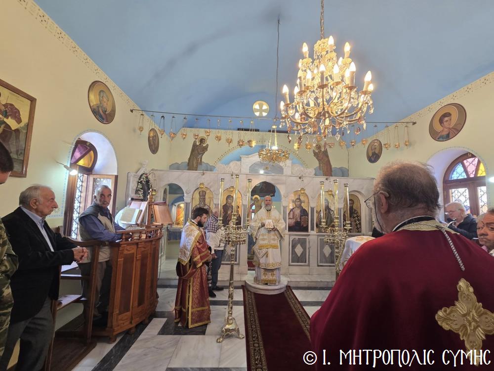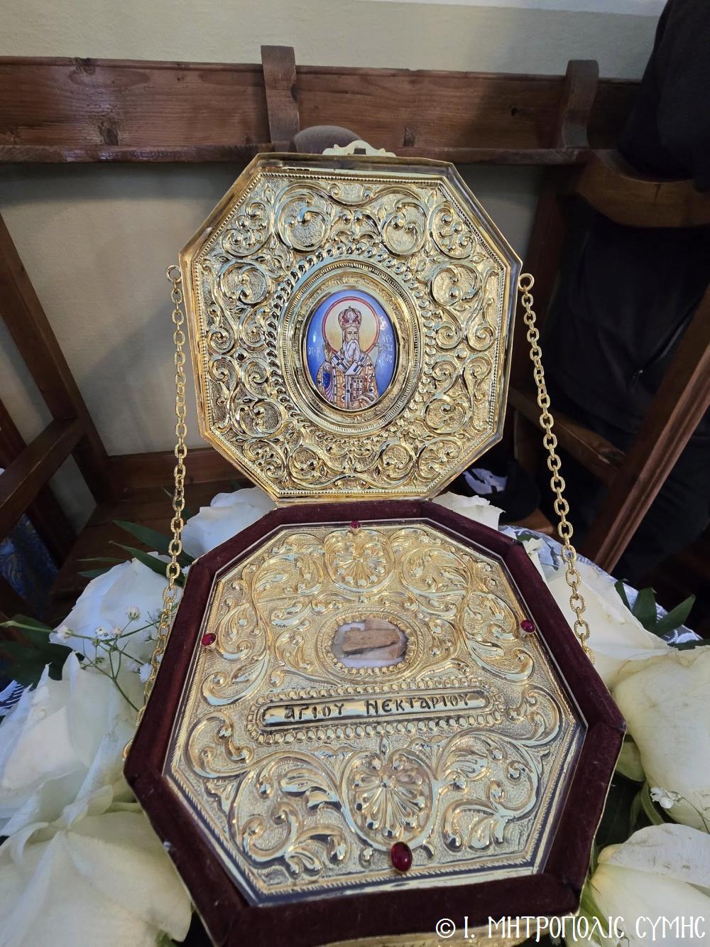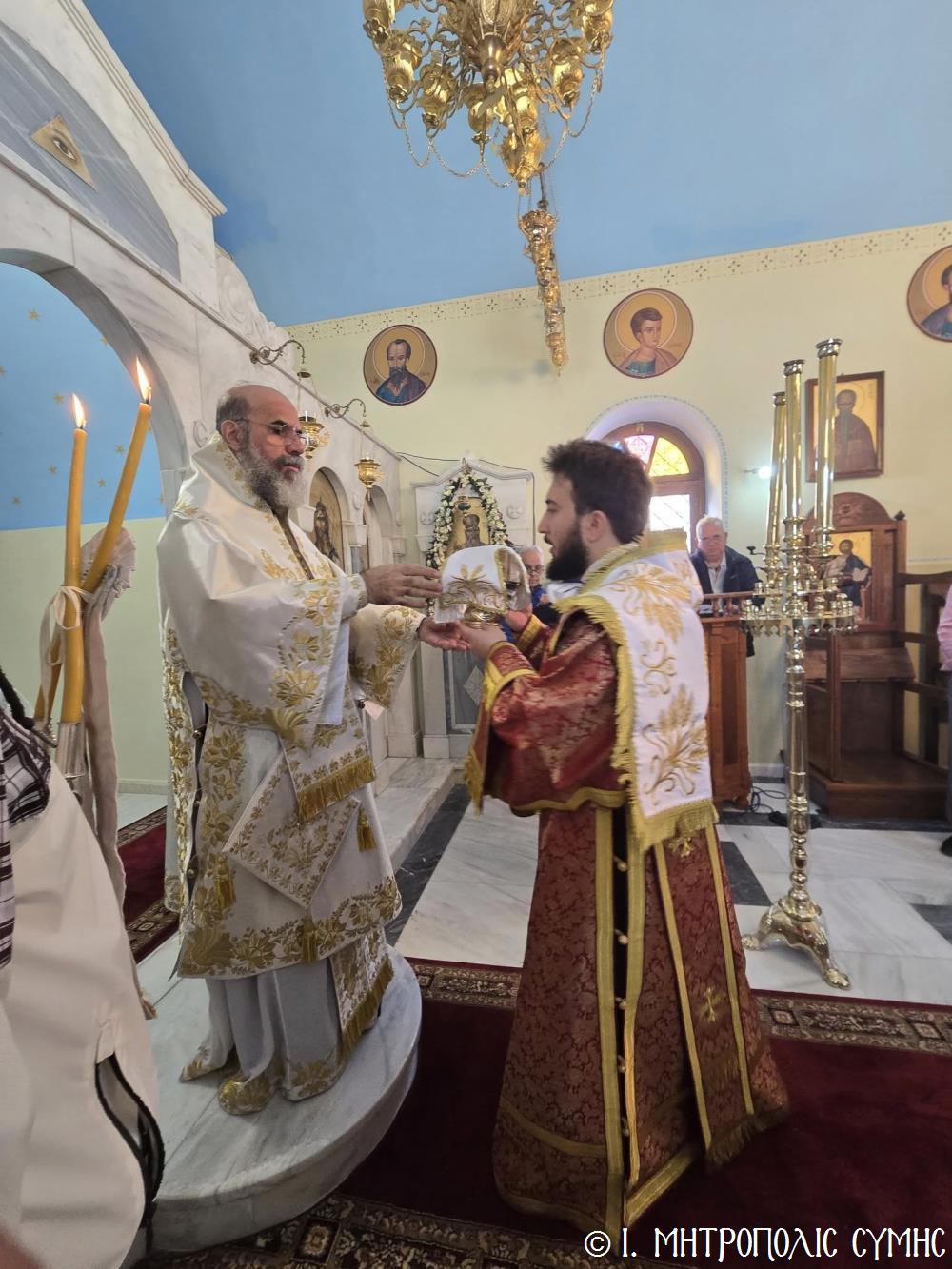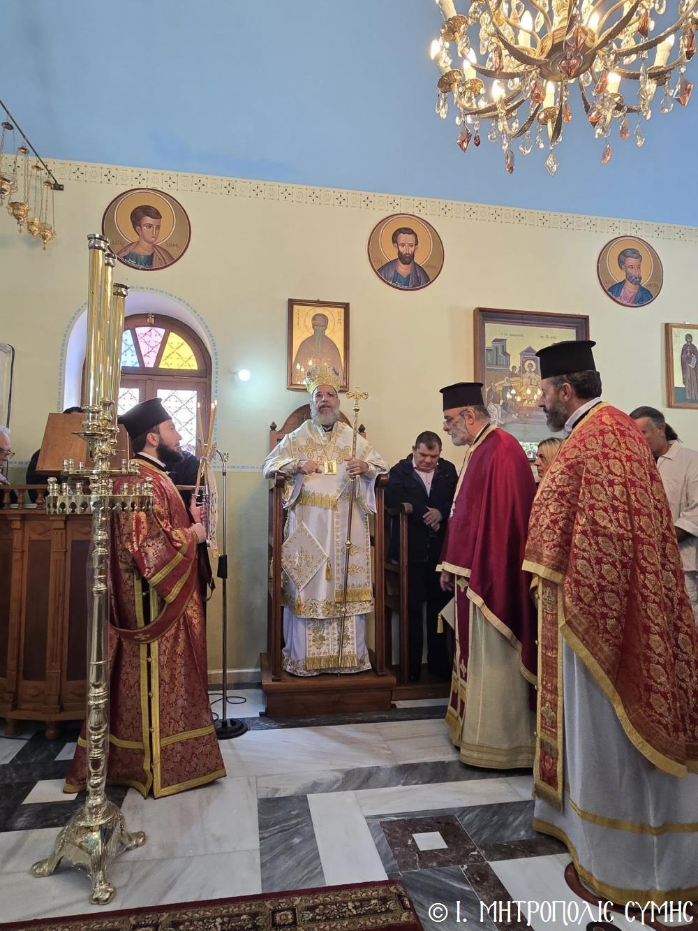 Ὁ Σεβ. Μητροπολίτης μας κ. Χρυσόστομος ἀφίχθη στόν πανηγυρίζοντα Ἱ. Ναό, κομίζοντας χαριτόβρυτο τεμάχιο Ἱεροῦ Λειψάνου τοῦ Ἁγίου Νεκταρίου, τοποθετημένο σέ περίτεχνη θήκη, προκειμένου οἱ πιστοί νά προσκυνήσουν καί νά λάβουν τήν εὐλογία τῆς Χάρης Του. Ἐν συνεχείᾳ χοροστάτησε στόν Ὄρθρο, εὐλόγησε τούς προσφερομένους Ἄρτους καί τέλεσε τήν Θεία Λειτουργία, ὡς καί τήν Διακονία τοῦ θείου λόγου, μέ συλλειτουργούς του τόν π. Στέφανο Μακρῆ Γεν. Ἀρχιερατικό Ἐπίτροπο, τόν π. Ἀντώνιο Μανιᾶ καί τόν Ἱεροδιάκονο π. Παῦλο Τερεζάκη. Τό ἱ. ἀναλόγιο διακόνησαν οἱ Ἱεροψάλτες, πατήρ καί υἱός, κ. Δημοσθένης καί Μερκούριος Γιανναρᾶς, ἐνῶ μεταξύ ἄλλων ἐκκλησιάστηκαν ὁ Δήμαρχος Σύμης κ. Ἐλευθέριος Παπακαλοδούκας καί ὁ Δκτης ΔΑΝ Σύμης Συνταγματάρχης κ. Χαράλαμπος Κατηφόρης.
