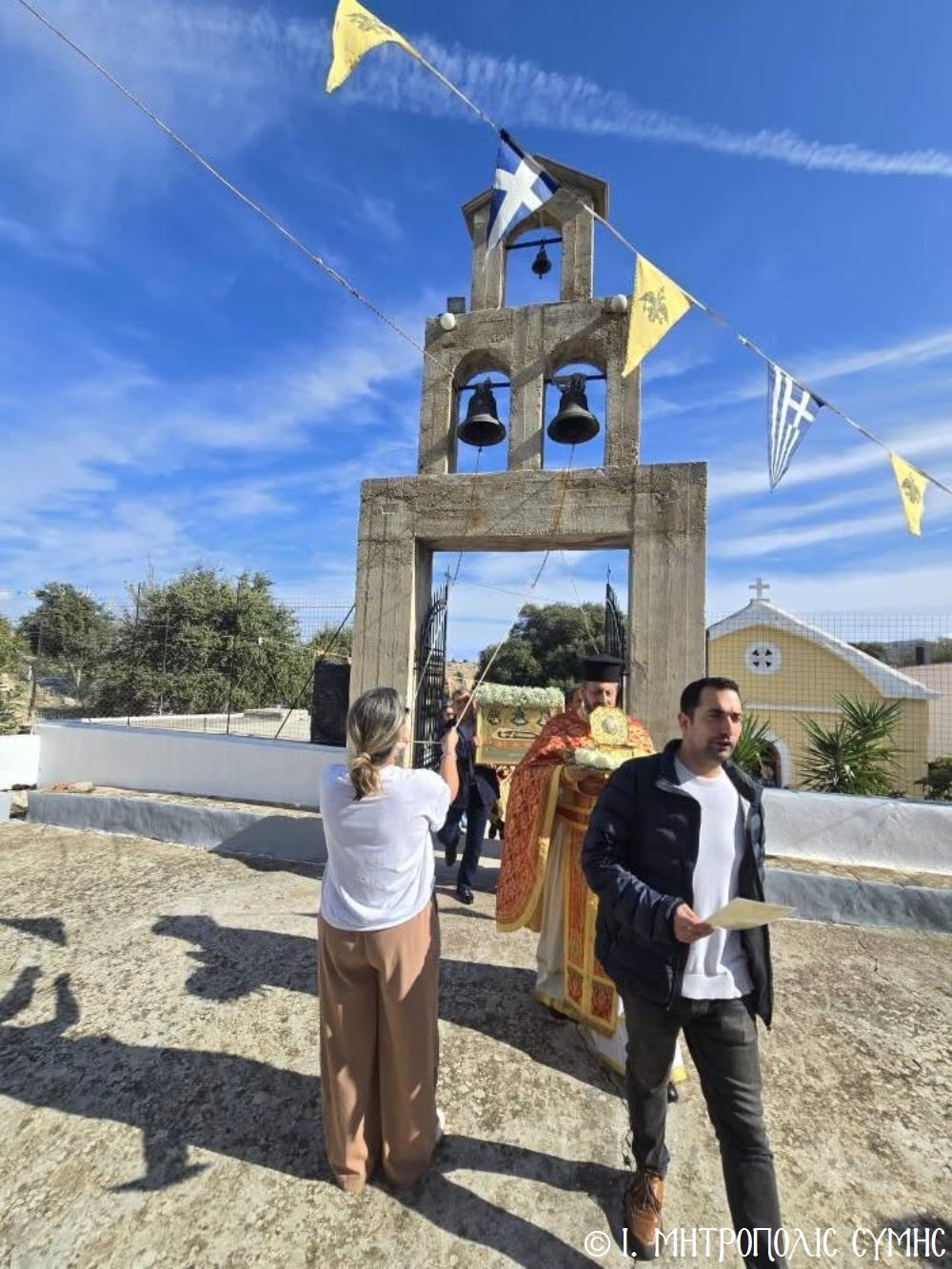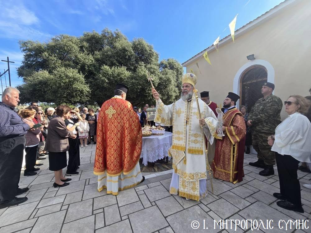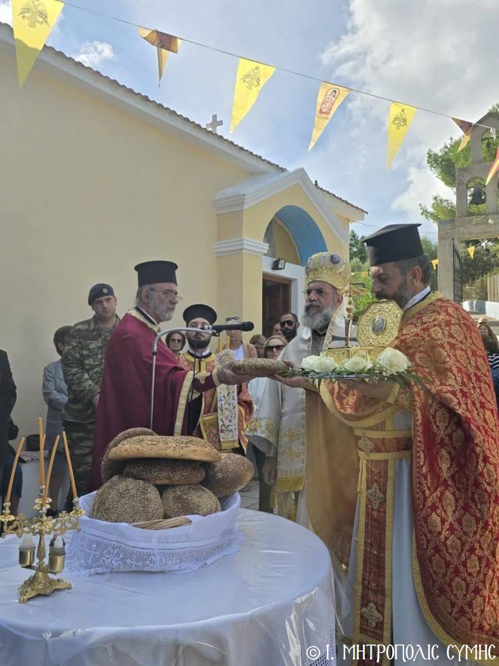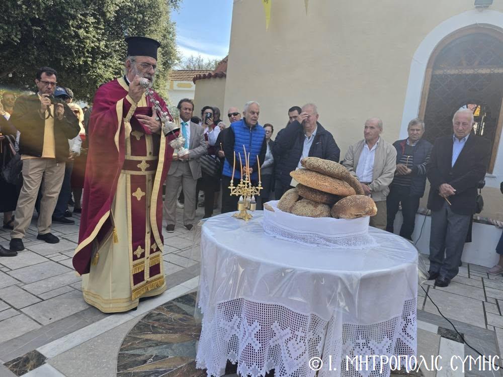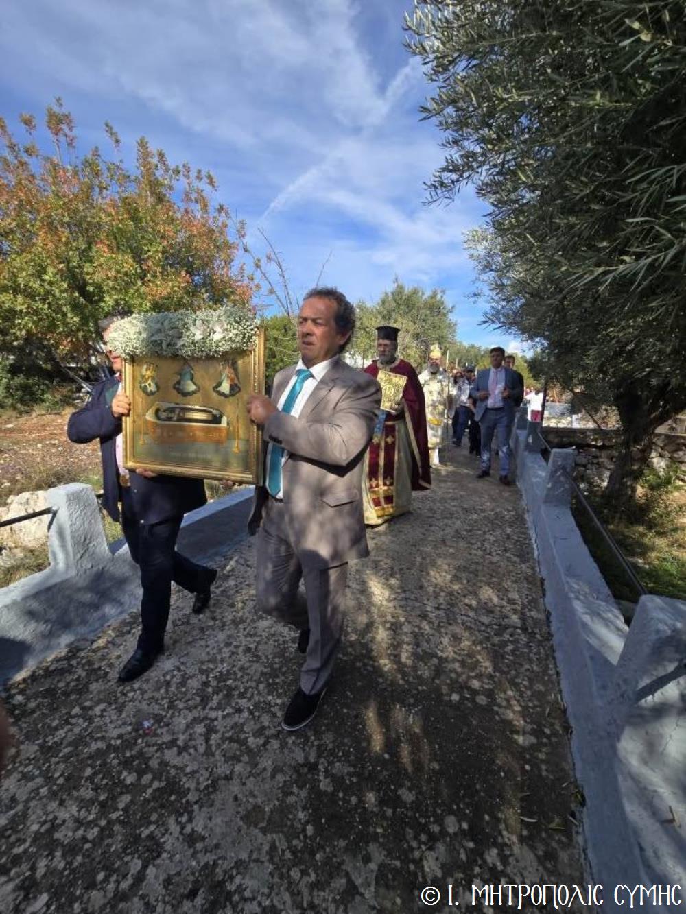 Ὁ Σεβ. Μητροπολίτης μας κ. Χρυσόστομος ἀφίχθη στόν πανηγυρίζοντα Ἱ. Ναό, κομίζοντας χαριτόβρυτο τεμάχιο Ἱεροῦ Λειψάνου τοῦ Ἁγίου Νεκταρίου, τοποθετημένο σέ περίτεχνη θήκη, προκειμένου οἱ πιστοί νά προσκυνήσουν καί νά λάβουν τήν εὐλογία τῆς Χάρης Του. Ἐν συνεχείᾳ χοροστάτησε στόν Ὄρθρο, εὐλόγησε τούς προσφερομένους Ἄρτους καί τέλεσε τήν Θεία Λειτουργία, ὡς καί τήν Διακονία τοῦ θείου λόγου, μέ συλλειτουργούς του τόν π. Στέφανο Μακρῆ Γεν. Ἀρχιερατικό Ἐπίτροπο, τόν π. Ἀντώνιο Μανιᾶ καί τόν Ἱεροδιάκονο π. Παῦλο Τερεζάκη. Τό ἱ. ἀναλόγιο διακόνησαν οἱ Ἱεροψάλτες, πατήρ καί υἱός, κ. Δημοσθένης καί Μερκούριος Γιανναρᾶς, ἐνῶ μεταξύ ἄλλων ἐκκλησιάστηκαν ὁ Δήμαρχος Σύμης κ. Ἐλευθέριος Παπακαλοδούκας καί ὁ Δκτης ΔΑΝ Σύμης Συνταγματάρχης κ. Χαράλαμπος Κατηφόρης.