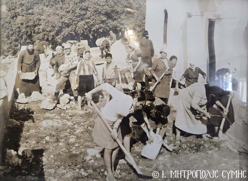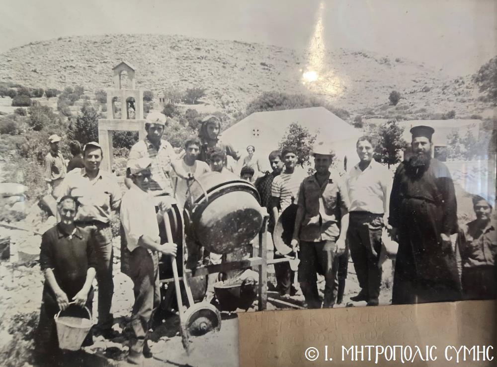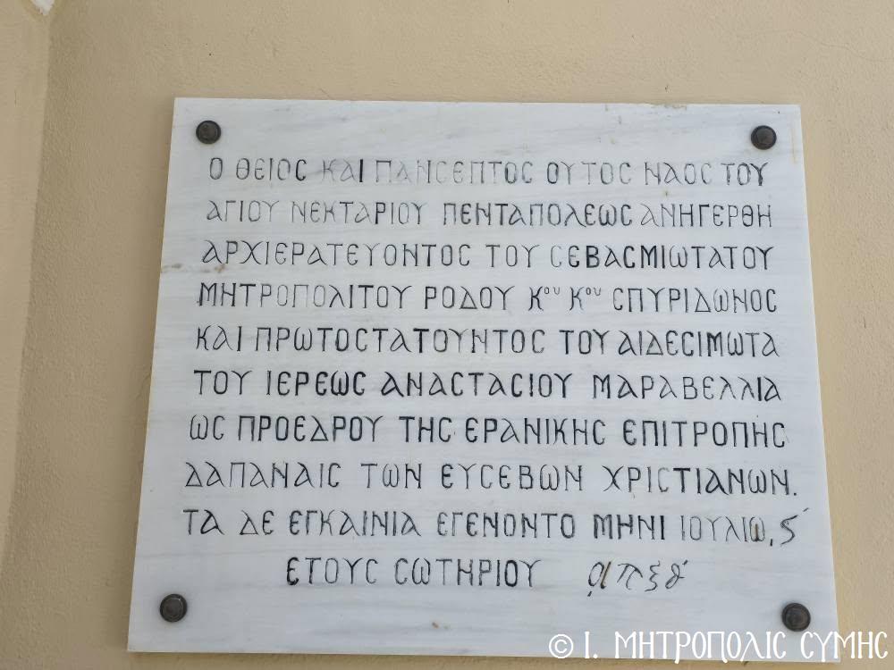 Ἀναφέρεται ὅτι τό Παρεκκλήσιον τοῦ Ἁγίου Νεκταρίου ἀνηγέρθη τό ἔτος 1969, μέ τήν εὐλαβῆ πρωτοβουλία καί ἐπιστασία τοῦ Ἐφημερίου τοῦ Μητροπολιτικοῦ Ἱ. Ναοῦ Τιμίου Προδρόμου, μακαριστοῦ Ἱερέως Ἀναστασίου Μαραβέλλια καί τήν πάνδημη συνδρομή καί συμμετοχή τῶν εὐσεβῶν κατοίκων τῆς Σύμης, οἱ ὁποῖοι μέ ἱερό πόθο καί "ἰδίαις χερσίν" ἐργάστηκαν ἀόκνως, ὥστε νά προσφέρουν στόν νεοκαταταγέντα τότε στούς Χορούς τῶν Ἁγίων, Νεκτάριο Ἐπίσκοπο Πενταπόλεως τόν ἐν Αἰγίνῃ τό νεόδμητο Ἱερό του Σέβασμα ἐν Σύμῃ.