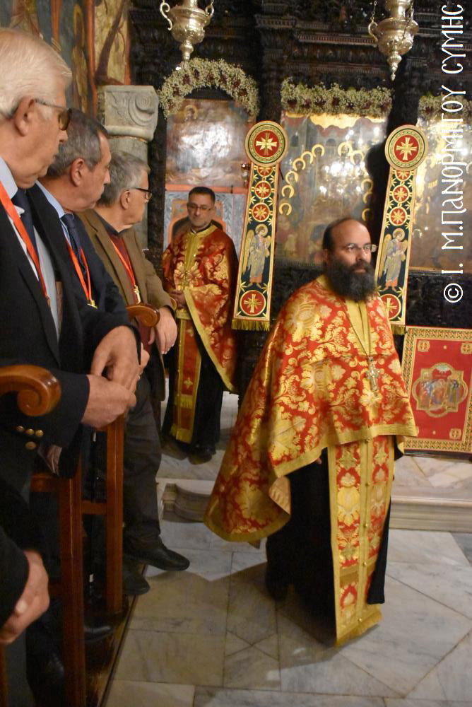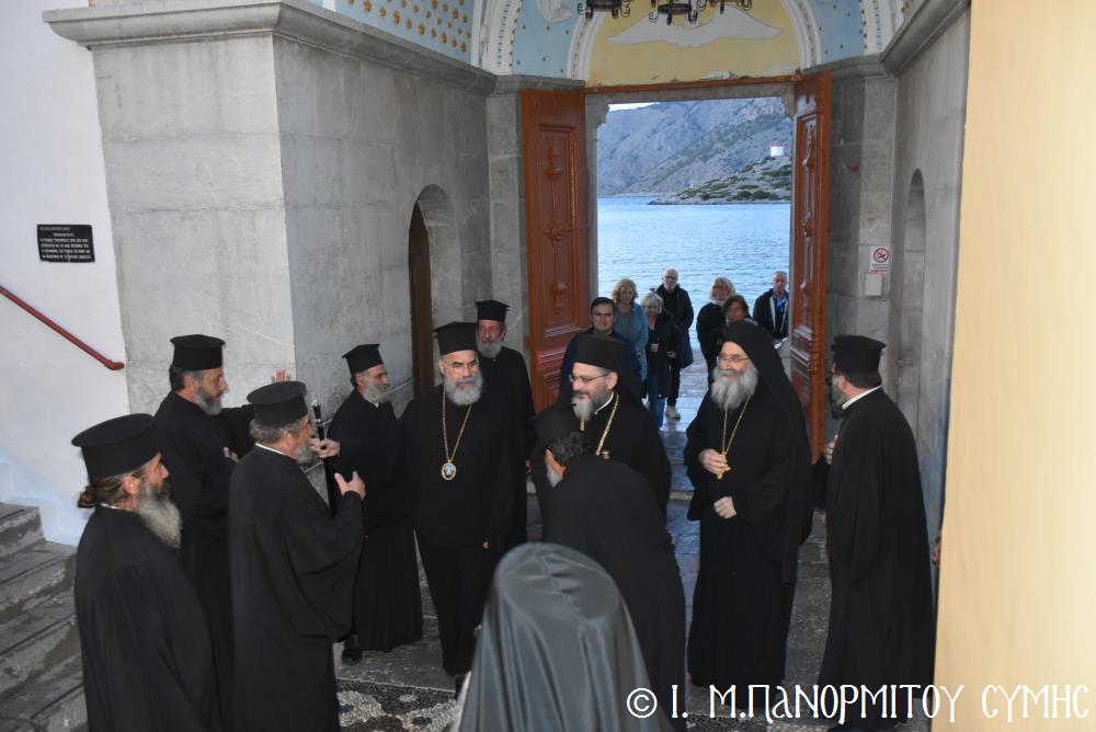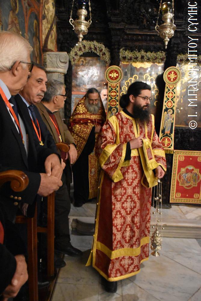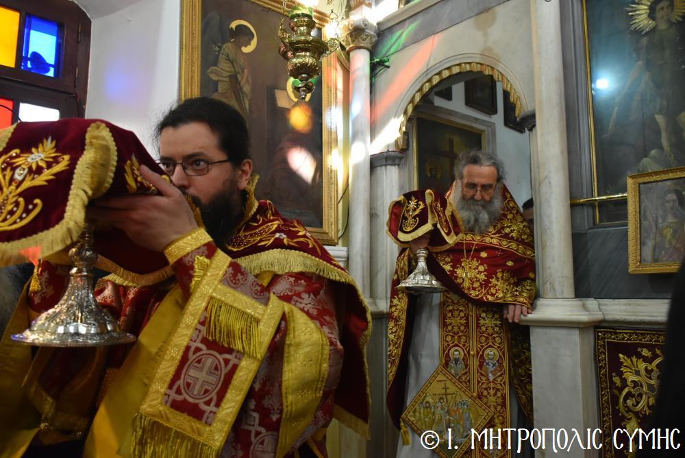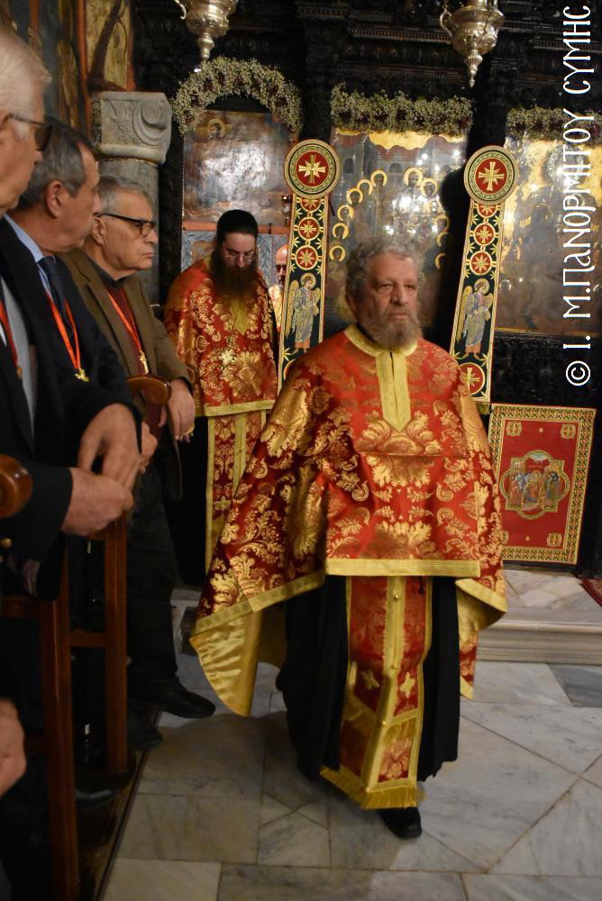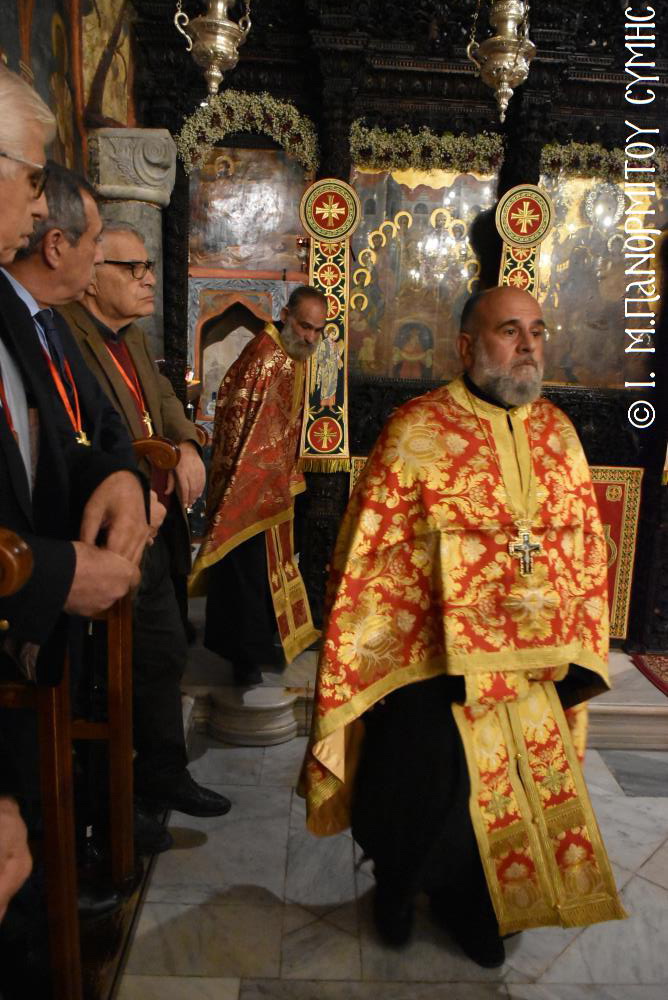Συλλειτούργησαν ἐπίσης, ἐξ Ἁγίου Ὄρους, ὁ Καθηγούμενος τῆς Ἱερᾶς Μονῆς τῶν Ἰβήρων Ἀρχιμ. π. Ναθαναήλ καί ὁ Ἱερομόναχος Γέρων Νεκτάριος Λαυριώτης, ἐπίσης ὁ Πανοσιολ. Ἀρχιμανδρίτης τοῦ Οἰκουμενικοῦ Θρόνου π. Νικόδημος Σκλέπας, ἡμέτερος ἐν Μεγίστῃ Ἀρχιερατικός Ἐπίτροπος καί ὁ Αἰδεσιμολ. Πρωτοπρεσβύτερος τοῦ Οἰκουμενικοῦ Θρόνου π. Ἐλευθέριος Χρυσοχόος, Γραμματεύς τῆς ἐν Ἀθήναις Ἐκπροσωπήσεως τοῦ Οἰκουμενικοῦ ἡμῶν Πατριαρχείου καί ἐκπρόσωπος τῆς Πατριαρχικῆς Ἐξαρχίας Πάτμου, μετά τῶν Ἱεροδιακόνων π. Ἀμβροσίου, π. Θεοτόκη καί π. Παύλου. Ἡ εὐθύνη τῆς Τάξεως τοῦ Τελετουργικοῦ ἀνετέθη εἰς τόν Ἱερομόναχον Χρυσόστομον, Γέροντα τοῦ ἐν Ἁγίῳ Ὄρει Ἱεροῦ Κελλίου Ἁγίου Ἰωάννου τοῦ Χρυσοστόμου, τά δέ ἱερά ἀναλόγια διηκόνησαν γλυκυφθόγγως χορός Συμαίων Ἱεροψαλτῶν, ὑπό τήν διεύθυνσιν τοῦ Πρωτοψάλτου τοῦ Ἱ. Μητροπολιτικοῦ Ναοῦ κ. Δημοσθένους Γιανναρᾶ, ἐνῶ ἡ συμμετοχή τῶν πιστῶν ὑπῆρξε πάνδημος καί ἐνθουσιώδης. Παρέστησαν συμπροσευχόμενοι, ὁ π. Φιλόθεος καί ὁ π. Χριστόδουλος ἐκ τῆς Ἱ. Μονῆς Κουτλουμουσίου, ὁ Γεν. Ἀρχιερατικός Ἐπίτροπος τῆς Ἱ. Μητροπόλεως Πρωτοπρ. π. Στέφανος Μακρῆς, ὁ Οἰκονόμος π. Σάββας Πατέρας Ἀρχιερατικός Ἐπίτροπος Χάλκης καί ἅπαντες οἱ Ἐφημέριοι τῆς Νήσου μας, μετά τῶν λοιπῶν ἐπισκεπτῶν Ἱερέων, ὡς καί ἡ Ὁσιωτ. ἡγουμένη τῆς Ἱ. Μονῆς Παναγίας Ὑψενῆς Ρόδου Ἀδελφή Μαριάμ.